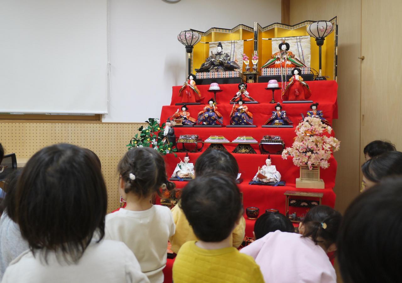 幼児クラスは、各クラスで、桃の節句の話を担任から聞いたりしたようですが、いちご組の子どもたちは、ひな人形をみんなで見て、いつもとは違う雰囲気をみんなと一緒に感じました。ひな人形を前にすると、興味津々で触ってみたくなる子がたくさんいましたが、中には「こわい…」と後ずさりする子、不安げに抱っこを求める子もいて、子どもたちのいろいろな反応を見ることができました。