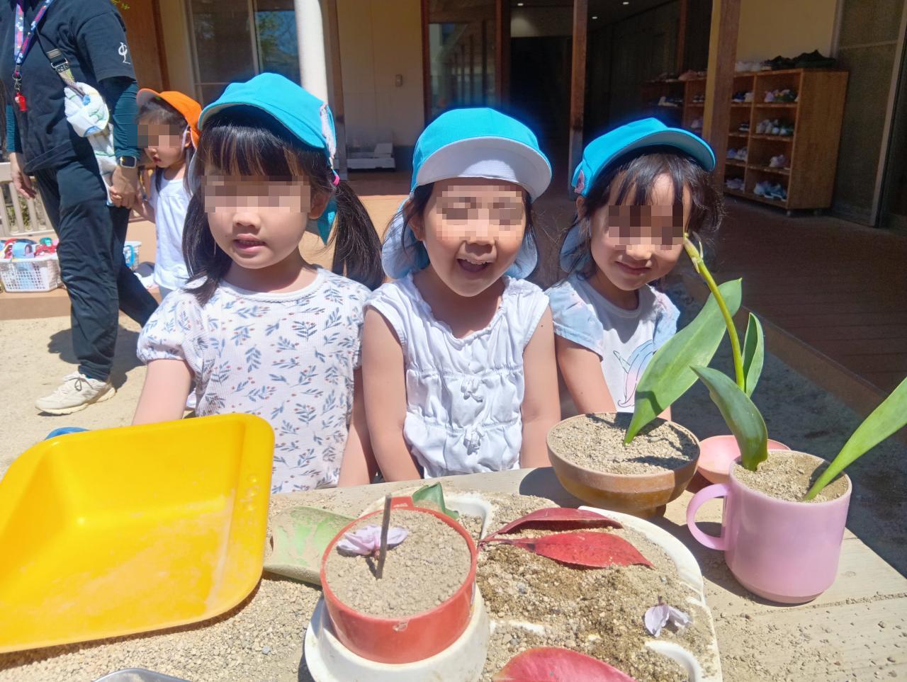 園庭では桜やアーモンドの木、チューリップが次々と花を咲かせ子どもたちの毎日に彩を添えてくれました。にぎやかだった花が散りはじめ、ひらひらと舞い落ちる花びらが地面を淡い色に染めています。落ちた花びらも子どもたちにとっては立派な遊び道具です。袋いっぱいに花びらを集めたり、ままごとで作ったケーキの飾りになったり。風に乗る花びらを追いかけて走り出したり...自然がそのままの遊びのきっかけになっています。