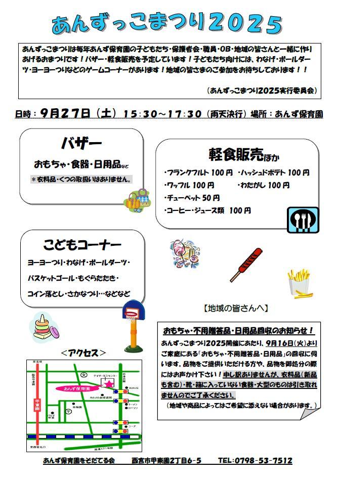 また、あんずっこまつりの開催にあたり、9月16日(火)よりご家庭にある「おもちゃ・不用贈答品・日用品」の回収に伺います。