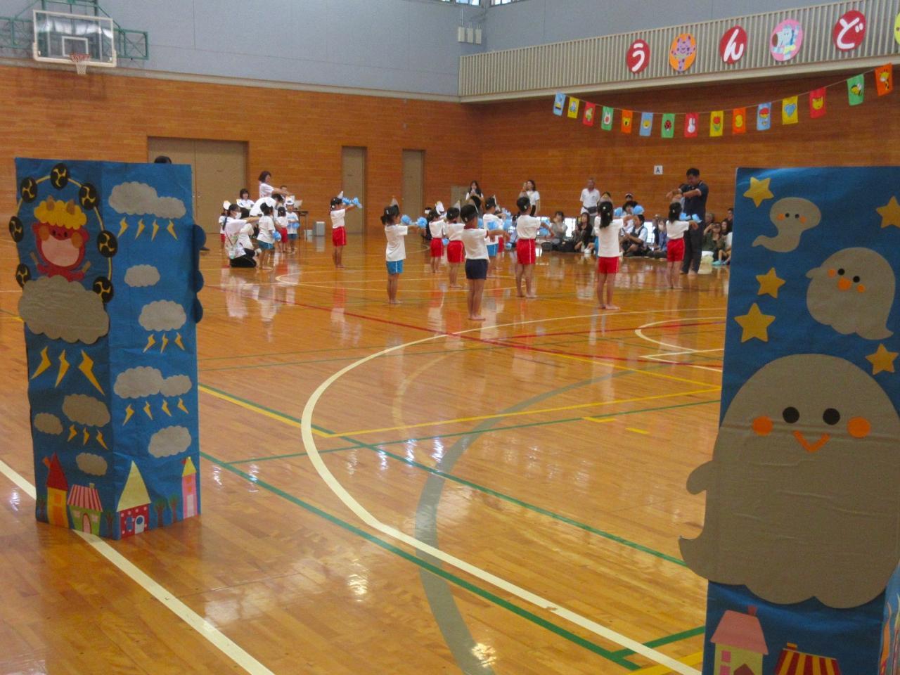 今年は、全クラスによる踊り「まっくらけっけっけ(お化け)」「かみなりビリビリ(かみなりさま)」をテーマにした入場門です(*^^)v