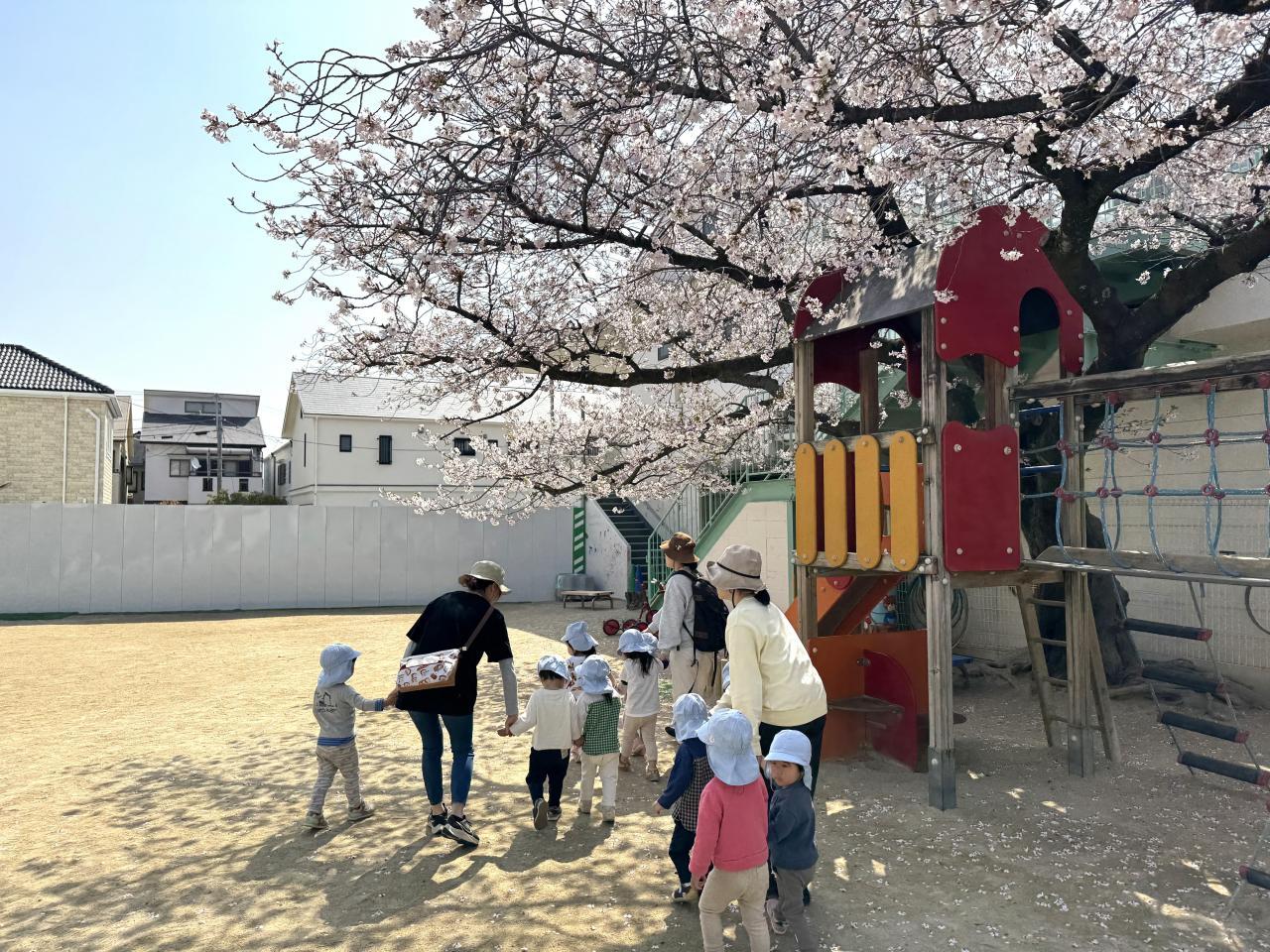 桜の花がとってもきれいに咲いていて、近くに行って眺めたり、花びらを拾って大事そうに持ったりと楽しむ様子がありました。