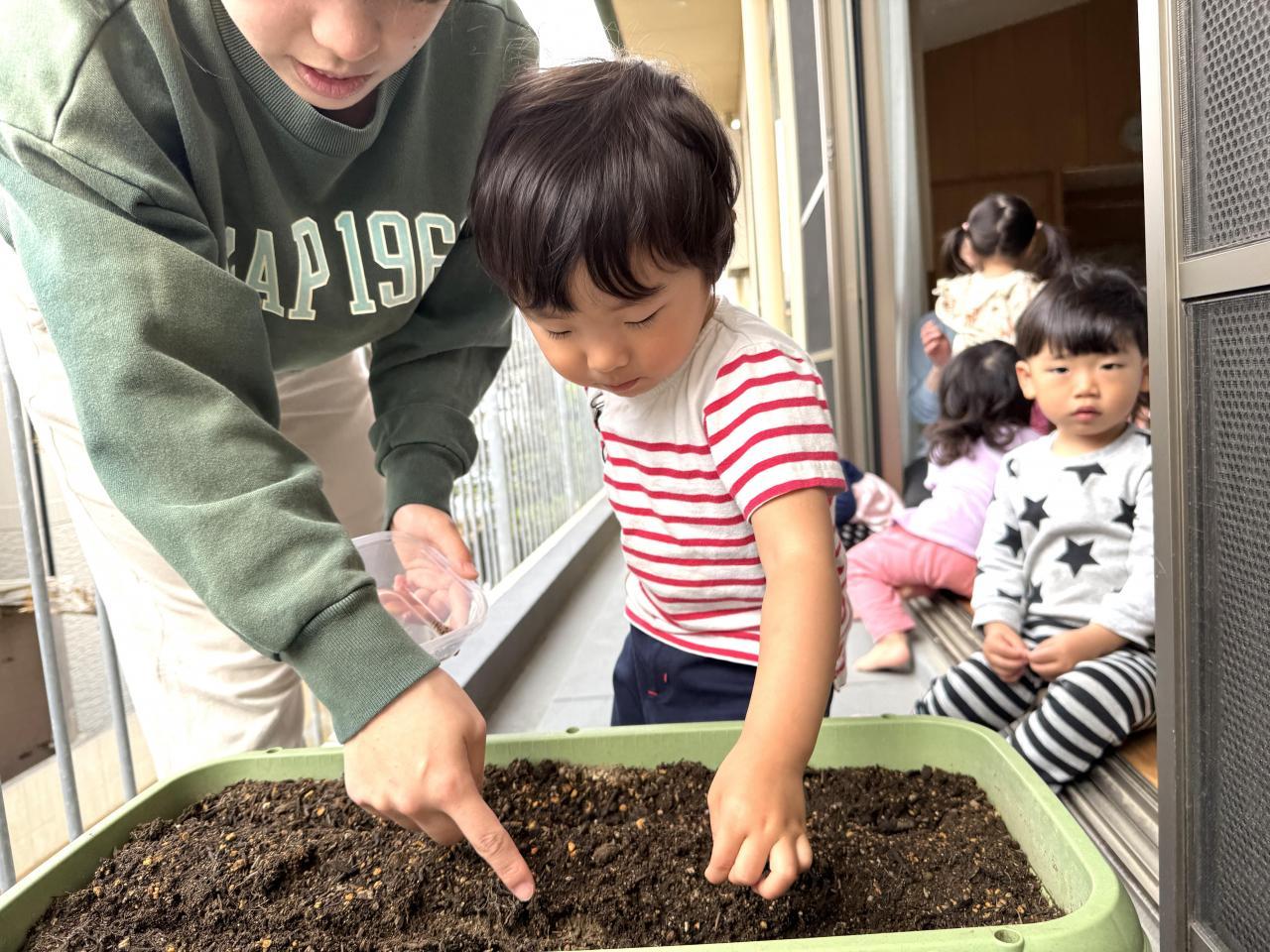 18日の朝には、うさぎぐみの子どもたちがプランターにラディッシュの種を植えました。