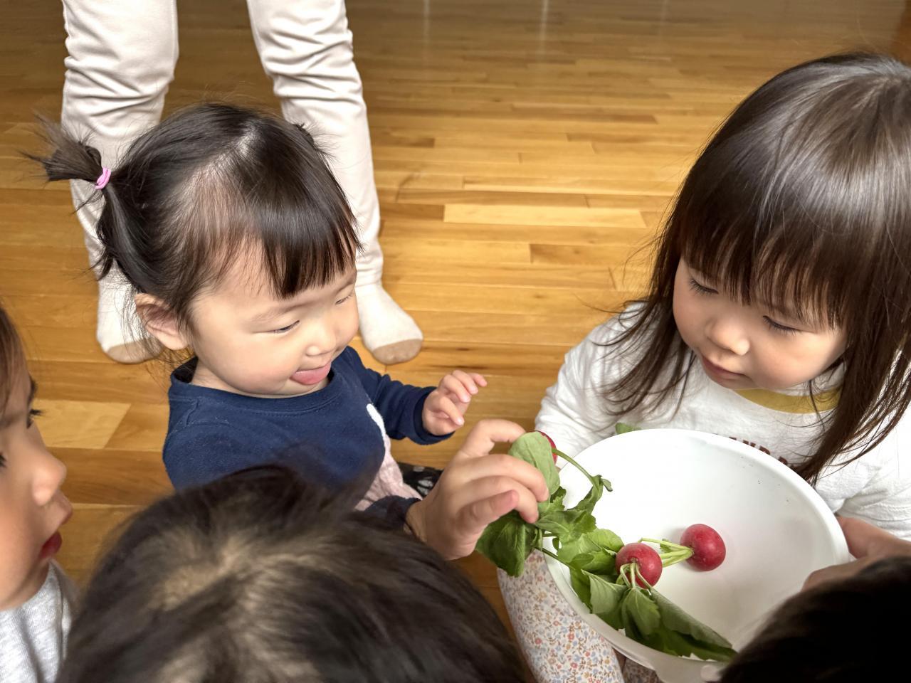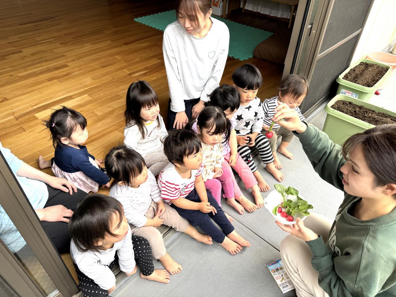 大きくなったらどんな野菜になるのか想像できるように本物のラディッシュを用意して、種を植える前にみんなで触ってみました。