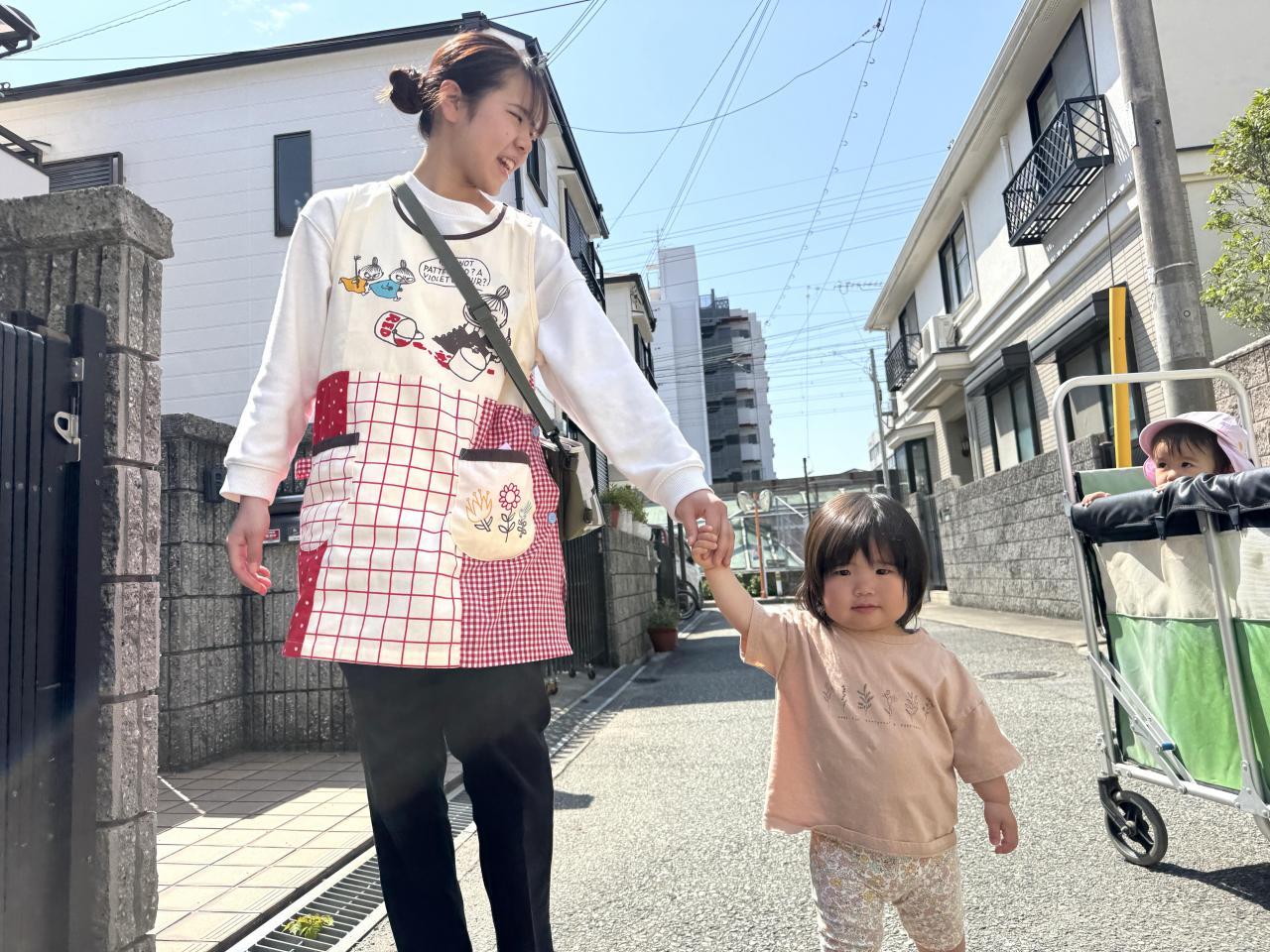 バギーに乗ったり、保育士と手をつないで歩くことにも慣れてきた様子で、気持ちの良い気候の中での散歩を楽しんでいました。