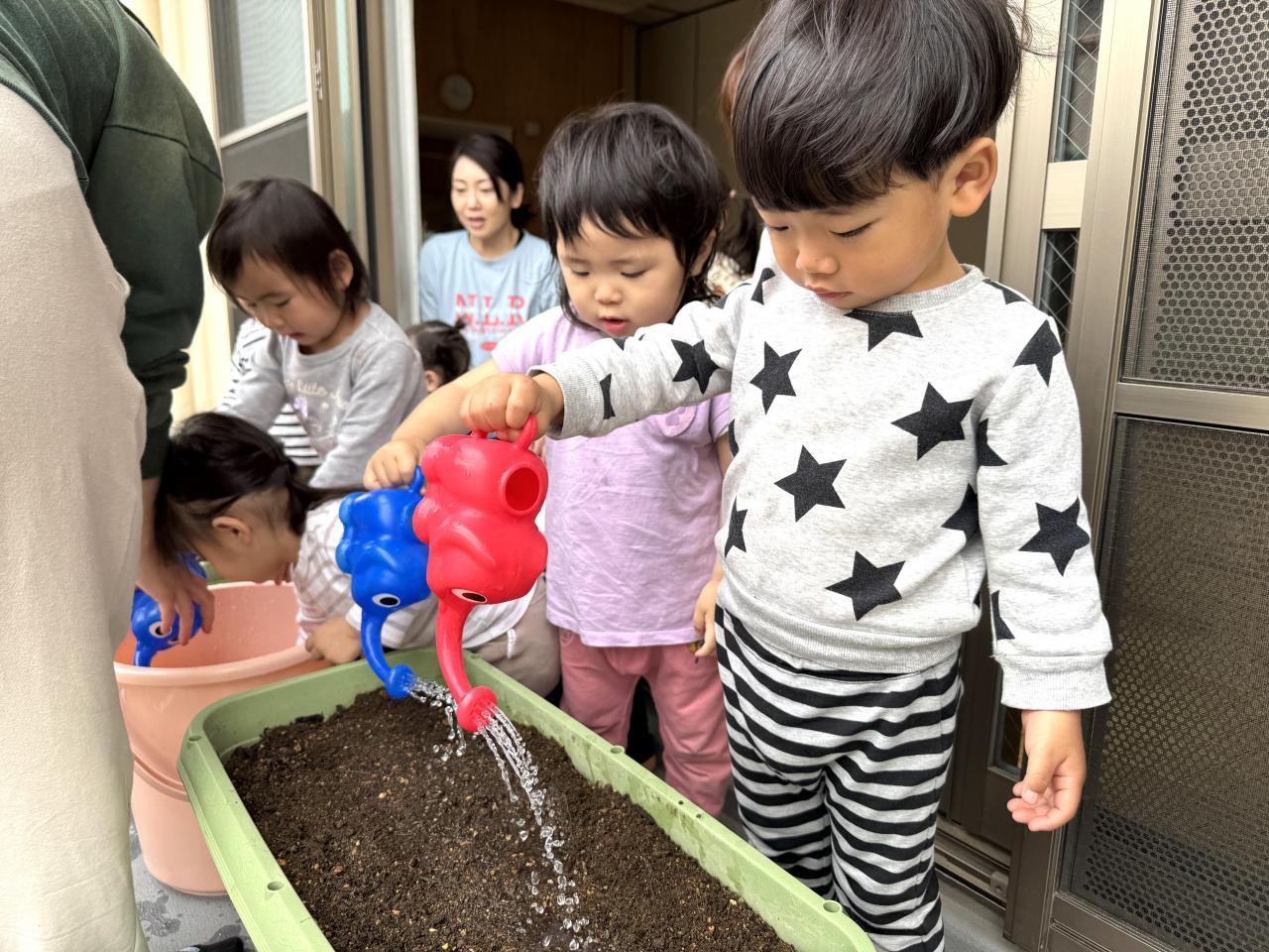 パラパラと優しく種を植えた後は、水やりもできて満足気な様子でした。