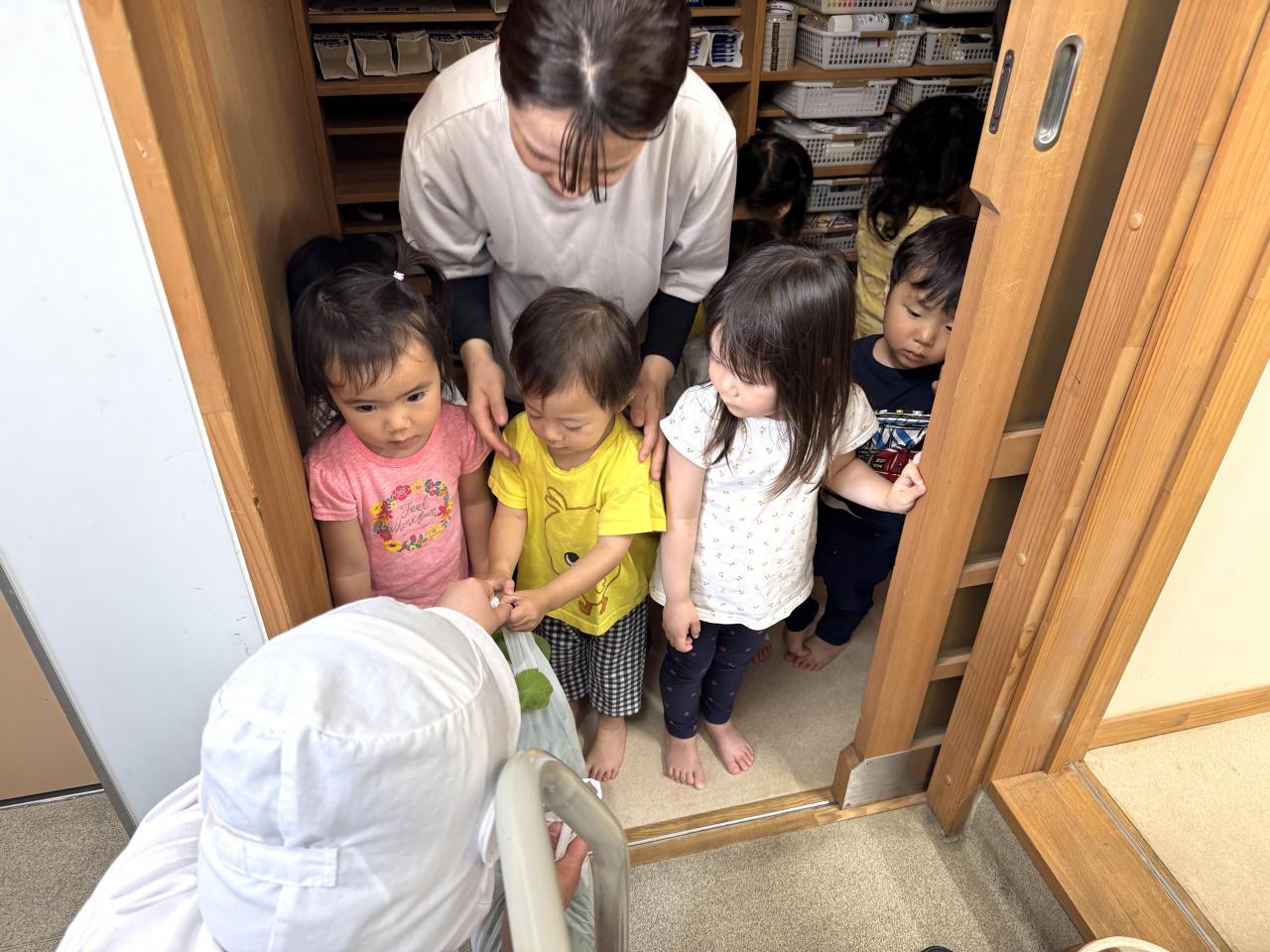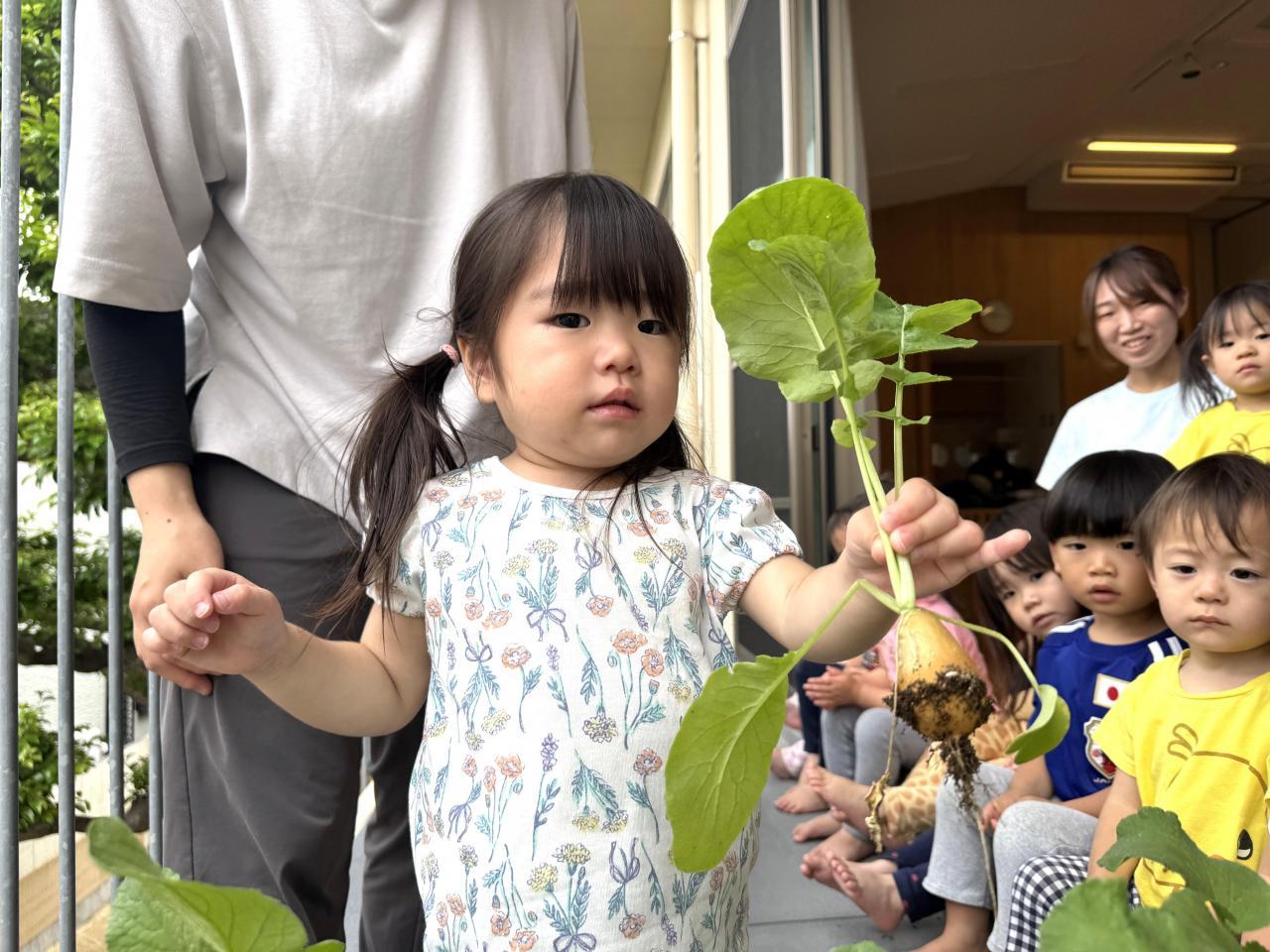 2歳児クラスの子どもたちが4月に種を植えて水やりをしていたラディッシュが大きくなったので、21日に収穫しました。