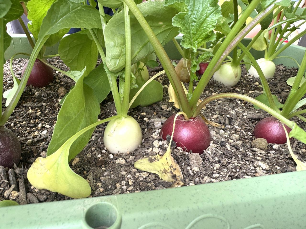 赤や白、黄色と、色とりどりのラディッシュが土から顔を出していて、「○○は赤!」と選びながら嬉しそうに抜いていました。