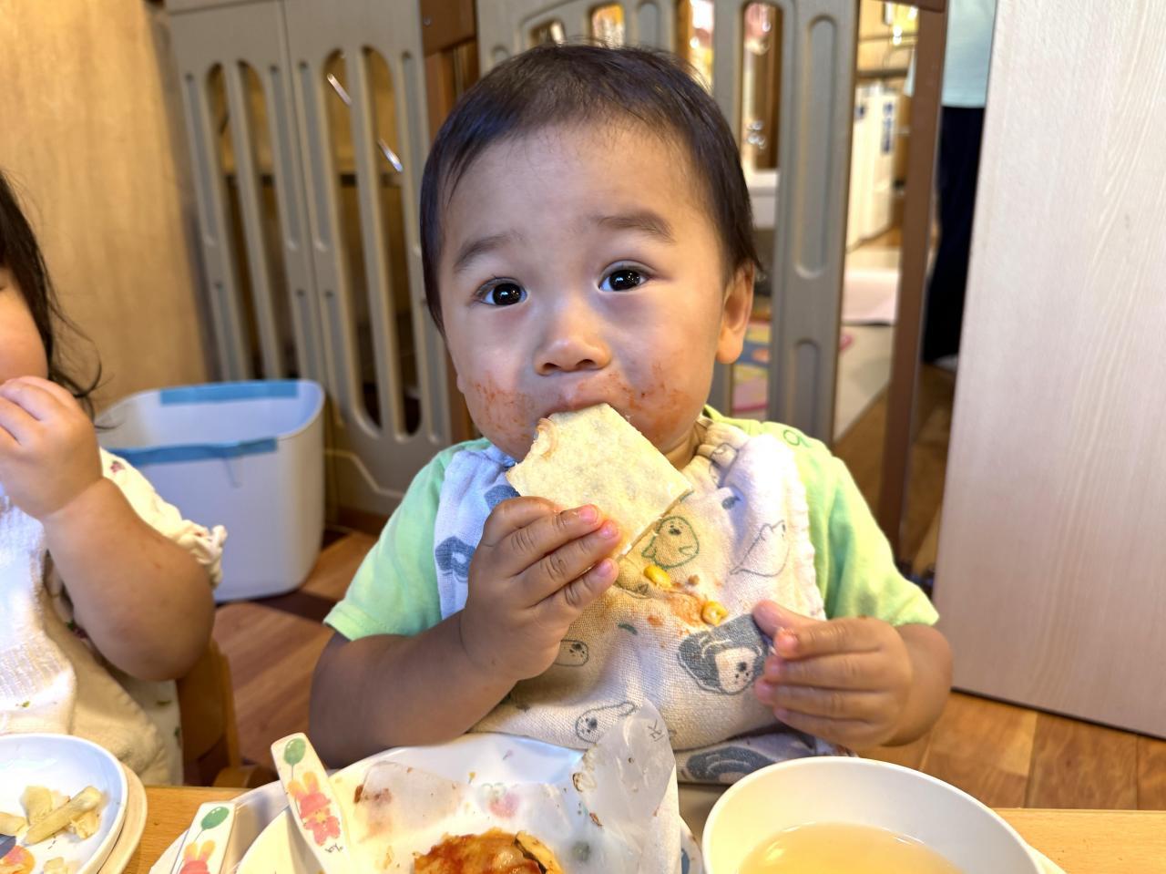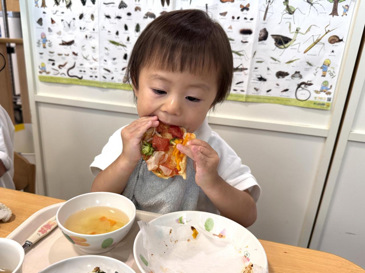 できあがったピザを見て大喜びの子どもたち!おいしそうにかぶりついていました。