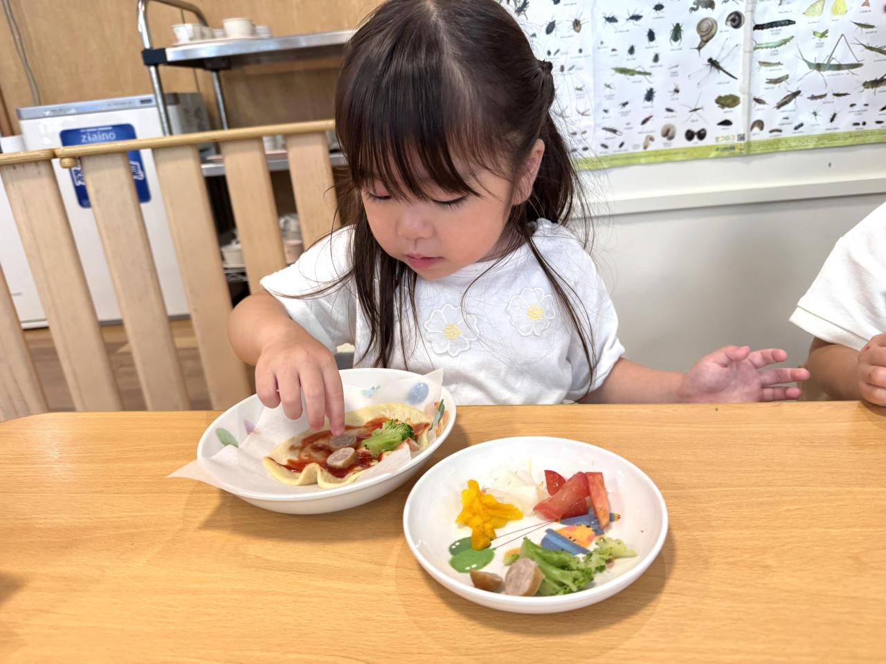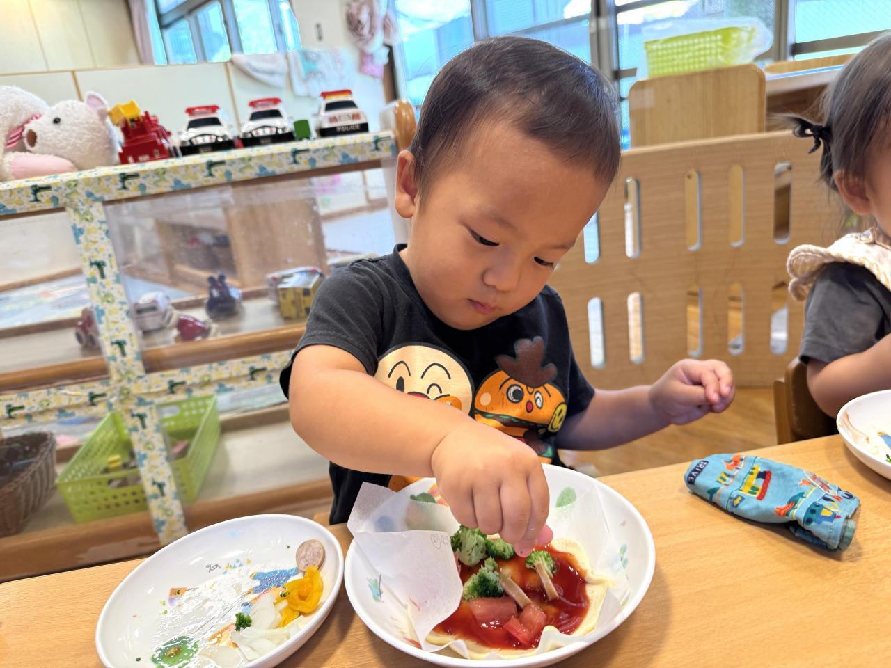 10日は、保育園の子どもたちはピザづくりをしました。