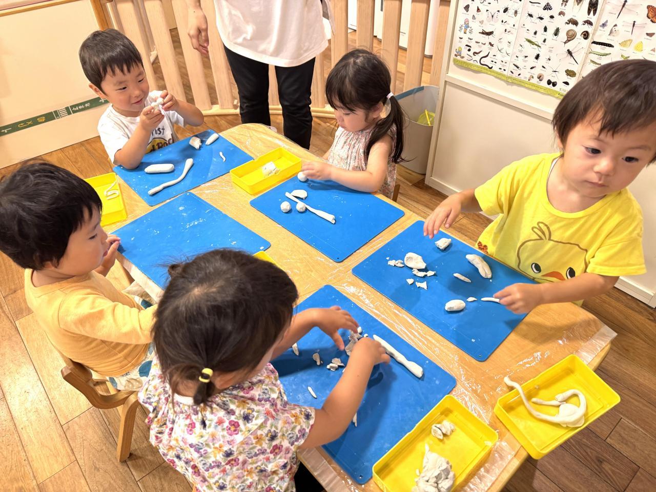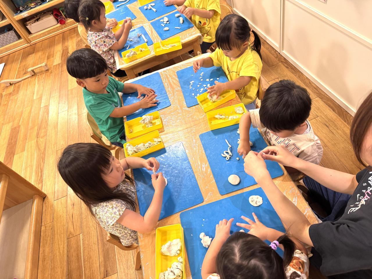 2歳児クラスの子どもたちは、初めて油粘土であそびました。