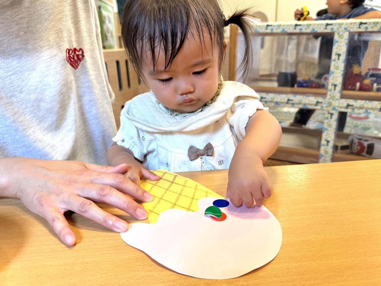 保育園では、1歳児クラスの子どもたちが、製作あそびでアイスクリームを作りました。