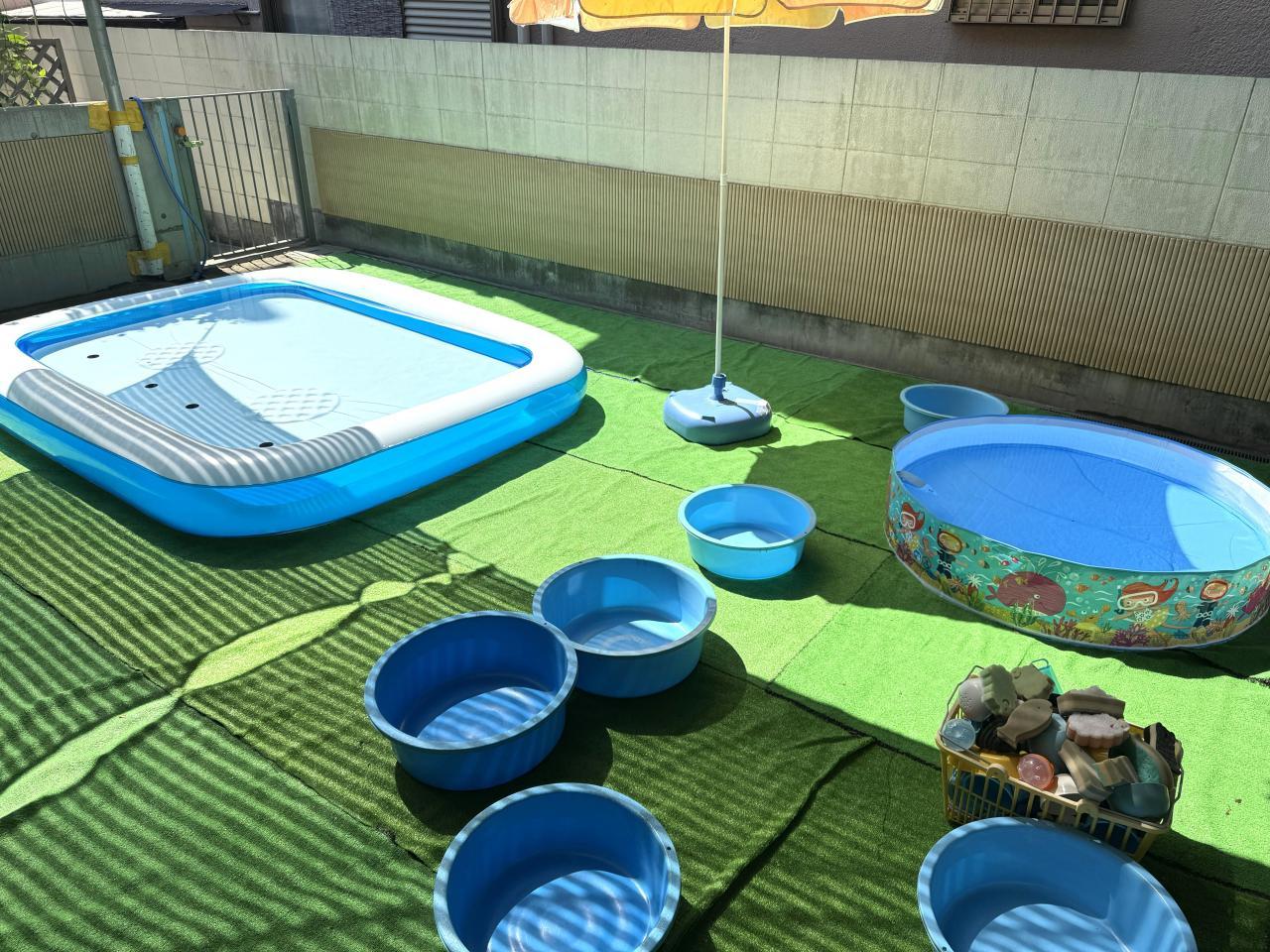少し深いプールや浅くて広いプールなど、子どもたちの様子や保育のねらいに合わせて毎日プールを変えていっています。