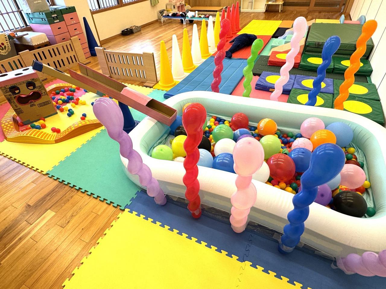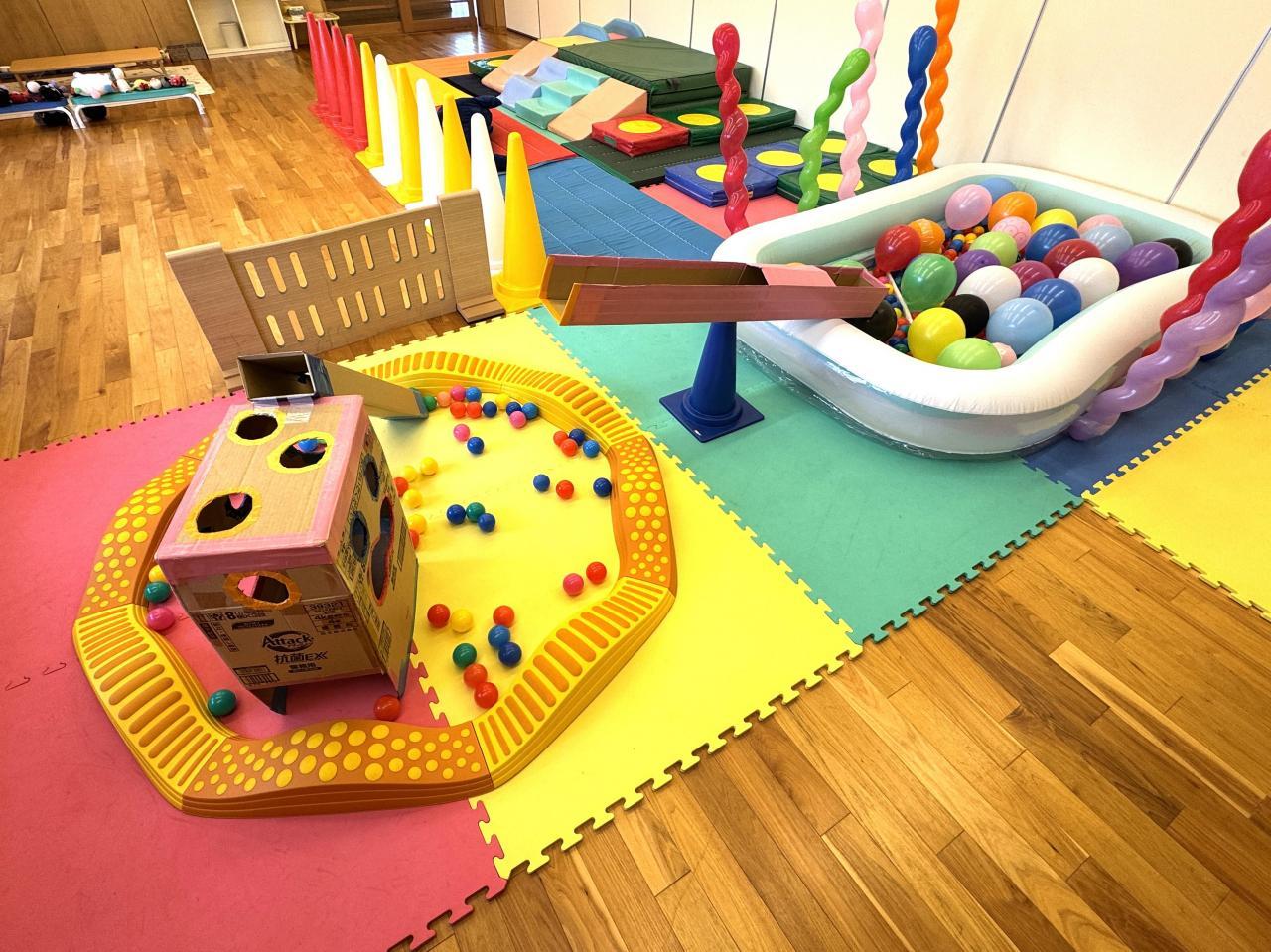 ボールプールに入ってボールの上に寝転がったり、坂道をボールが転がる様子を繰り返し眺めたりと思いおもいに楽しんでいました。