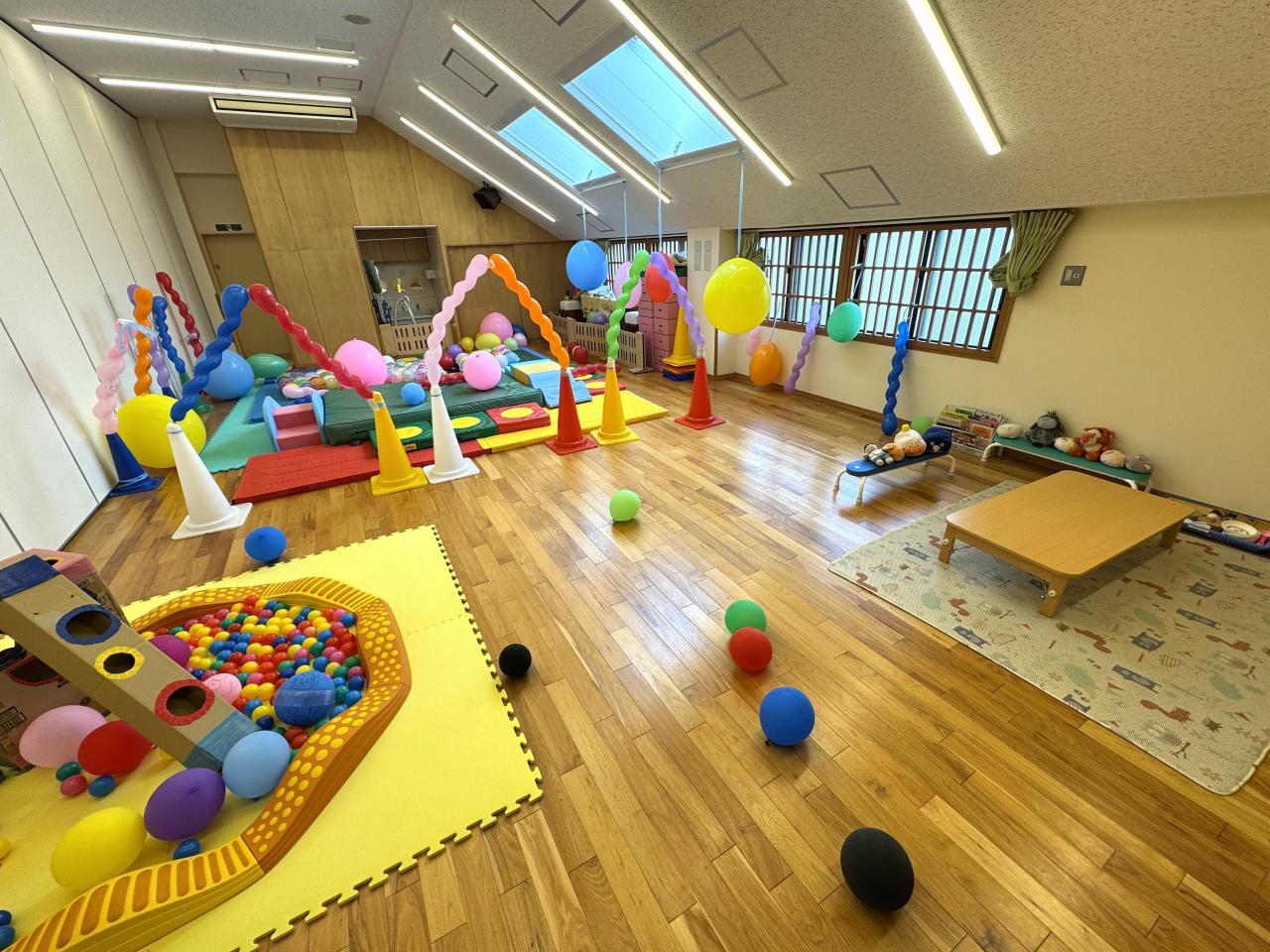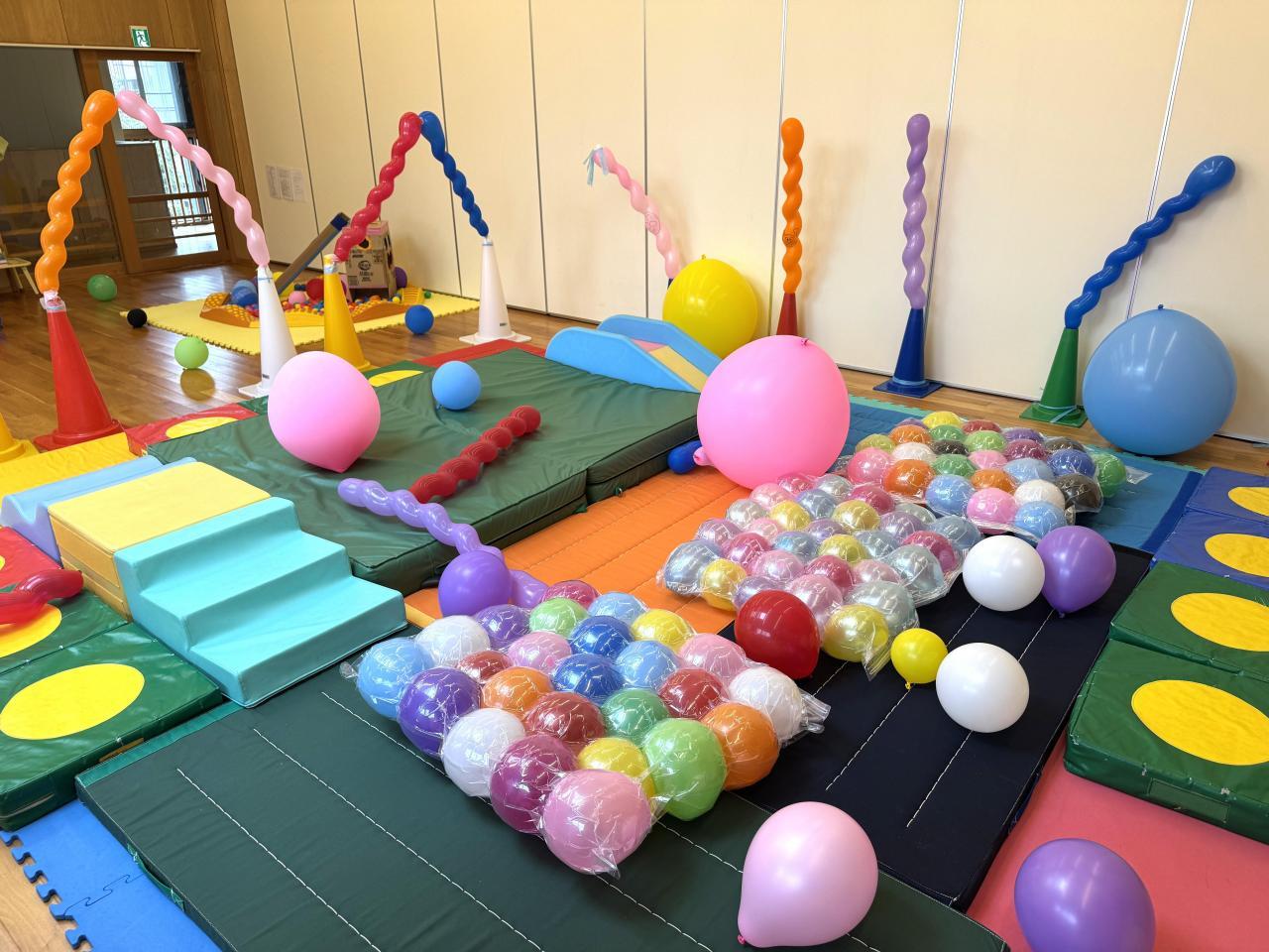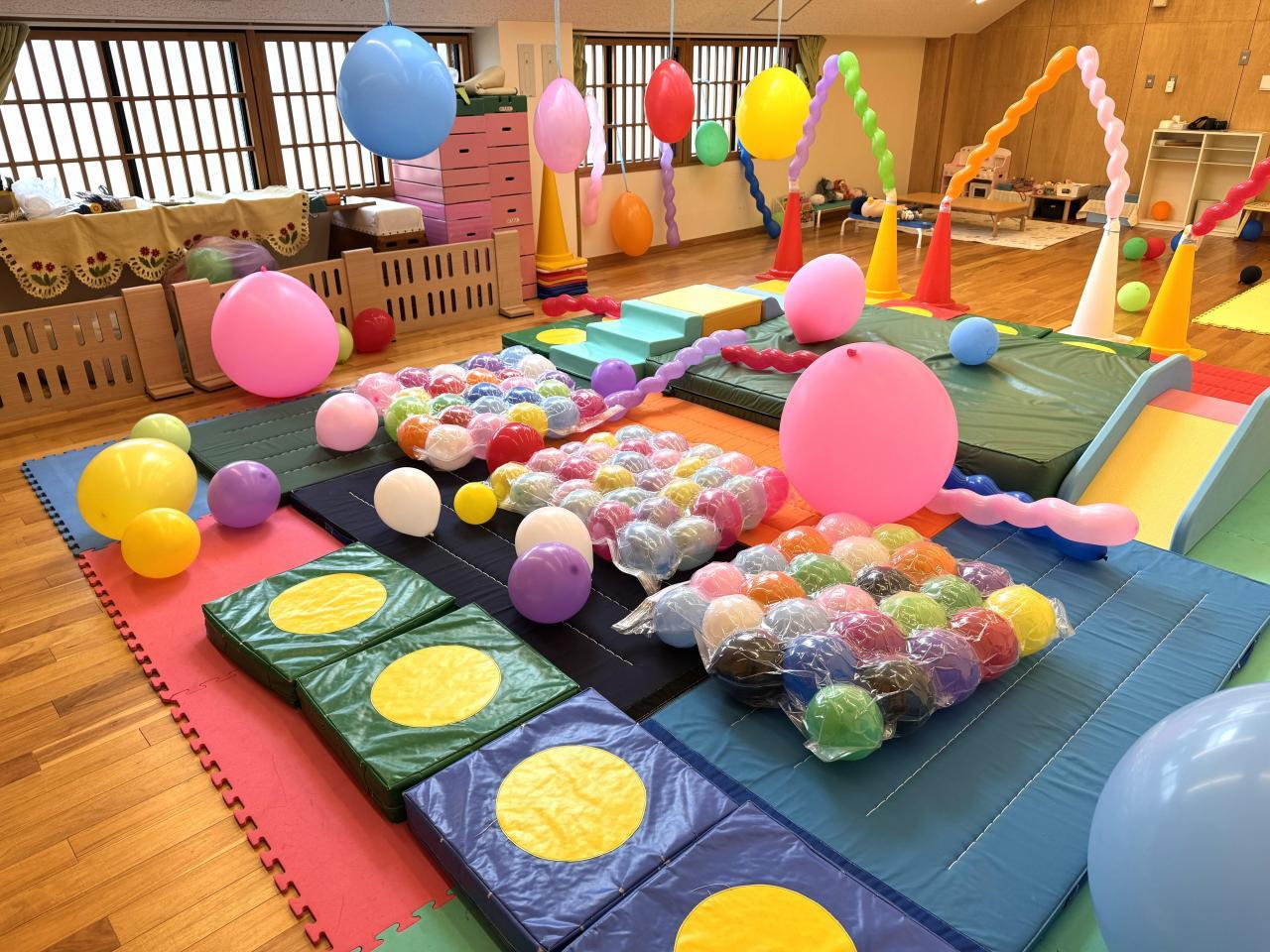 壁や天井からぶら下がった風船をパンチしたり、布団圧縮袋に作った風船ベッドの上に乗ったり寝転んだりと、全身を使って楽しくあそぶ姿がありました。