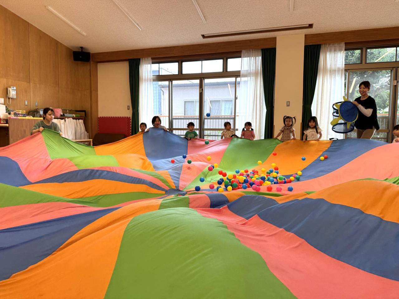2歳児クラスの子どもたちは久しぶりのパラバルーンあそびに大興奮でした!
