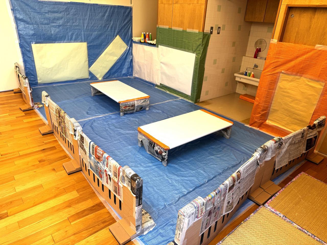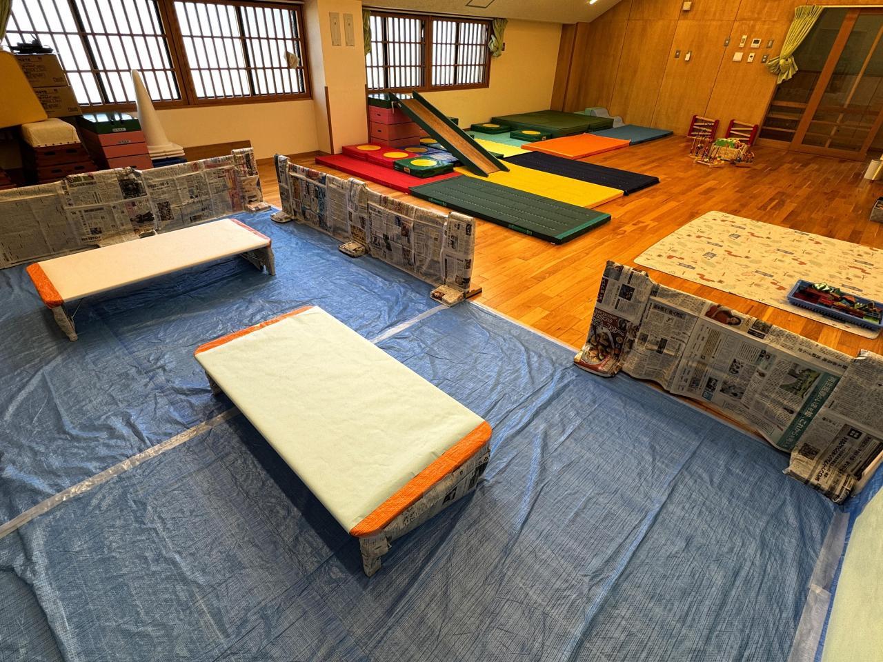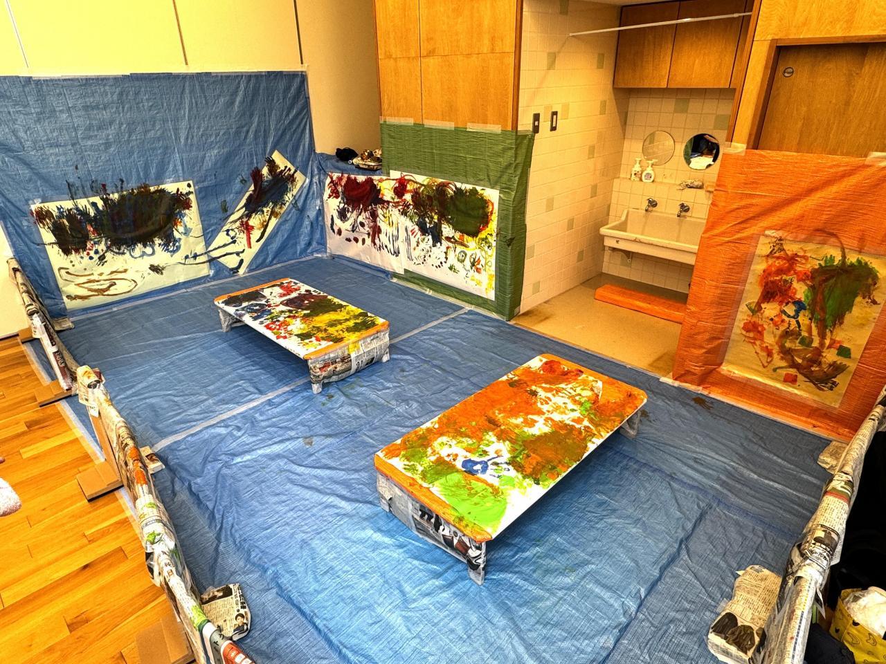 今回は壁にも模造紙を貼ったりサークルに新聞紙を貼って、いろいろなところに色を付けられるようにすると、どこにしようかと選びながら思いおもいに表現していました。