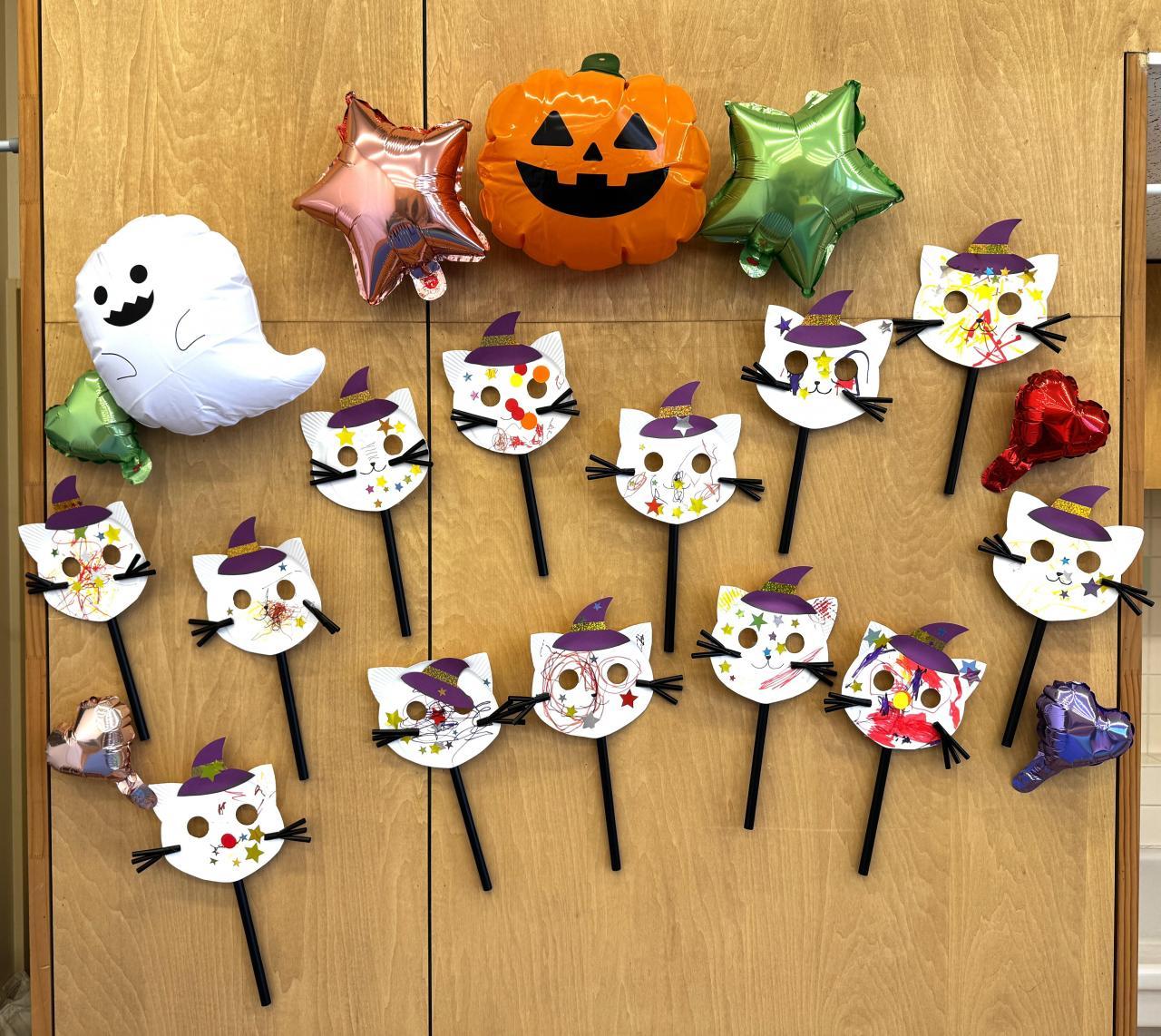 目や口をくり抜いたねこやかぼちゃの形の紙皿に、ペンで自由に模様を付けたり丸や星型のシールを貼ってとてもかわいいお面やカバンができました。