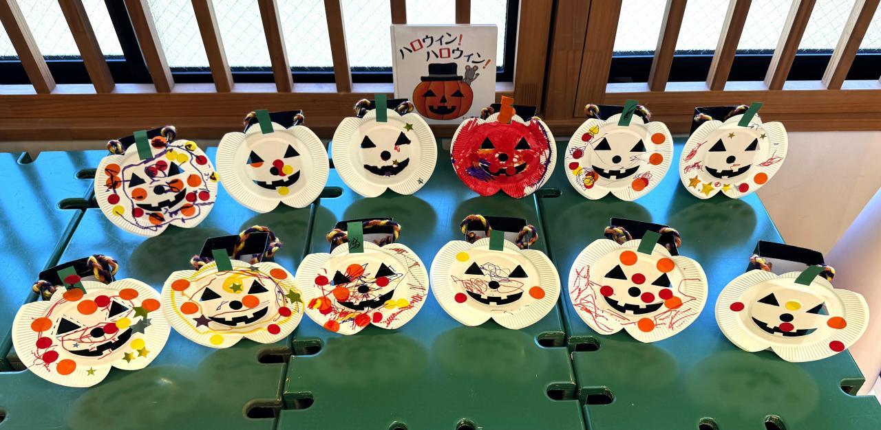 23日の子育て支援では、ハロウィンの製作あそびで、ねこのお面やかぼちゃのカバンを作りました。