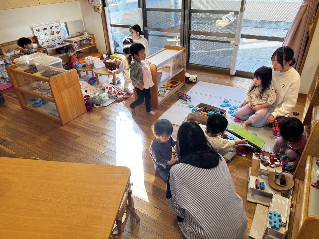 保育参観と言っても周りで見て終わりではなく、実際に保護者の皆さまに保育室に入ってもらい、一緒に子どもたちと過ごしてもらいました。
