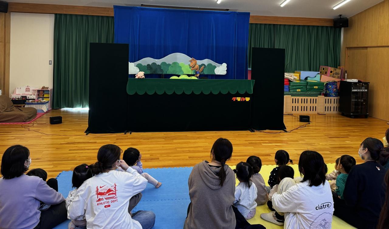今週は、5日に人形劇団クラルテさんがホールで人形劇をしてくれて、保育園の子どもたちと子育て支援教室の子どもたちが一緒に参加しました。