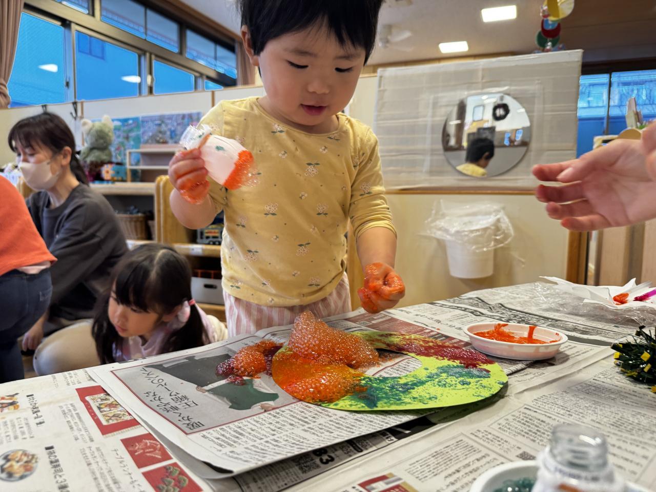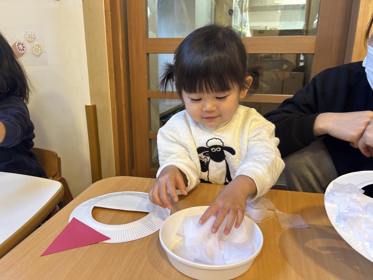 ビリビリちぎって感触を楽しんだり、小さく丸めて立体的に貼り付けてみたりと思いおもいに楽しむ姿がありました。