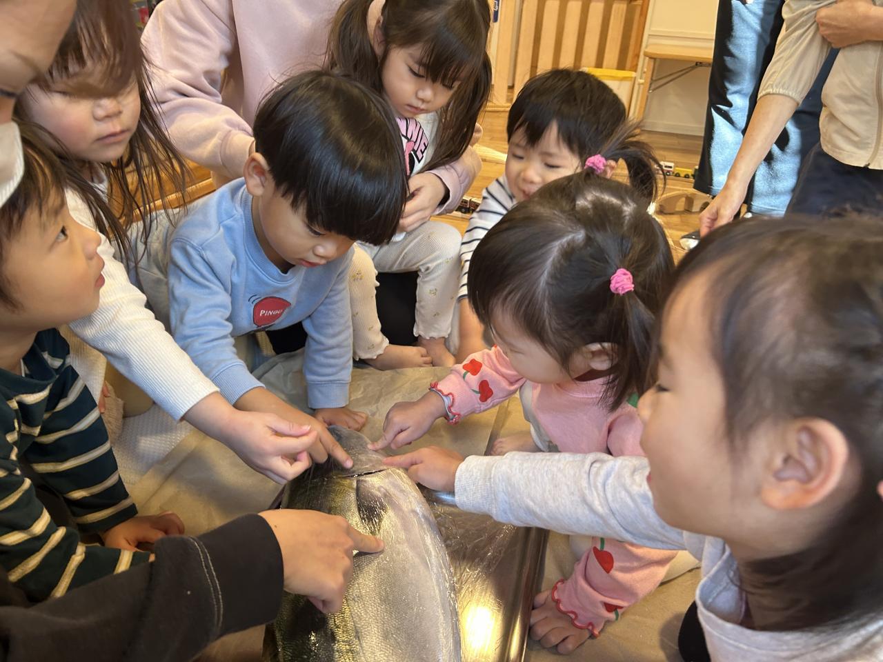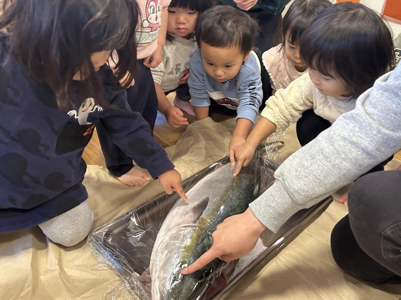 1歳児クラスの子どもたちは、初めて見る本物の大きな鰤に、ちょっぴり驚いていた様子でしたが、ツンツンと触ってみたり、近付いて覗いてみては指差しをして保育者に思いを伝えようとしていました。