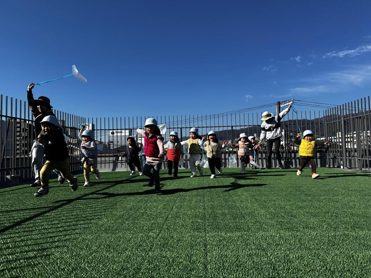 「見て~!」と高く手をあげて、友だちと一緒に笑顔で走りまわったり、保育者があげたカイトを眺めたりと、久しぶりの広い屋上を楽しんでいました。
