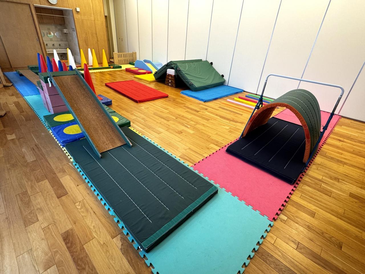 マットの山の高さを変えたり、すべり台を板に変えて難かしくなっていくと、最初は恐るおそるだったのが、バランスを取りながら徐々にスピードを上げてすべったりと、思いおもいに楽しんでいました。
