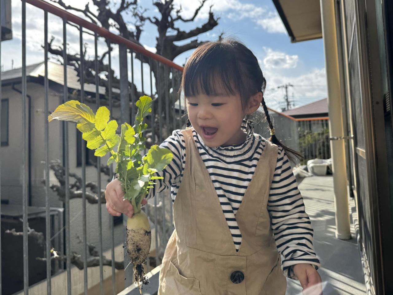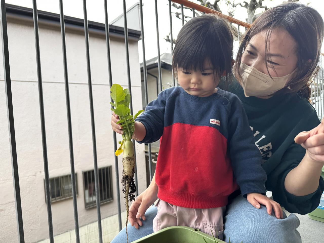 翌日の給食で大根のナムルやお味噌汁に入れてもらうと、「大根あった!」と何度も探しながら食べていました。