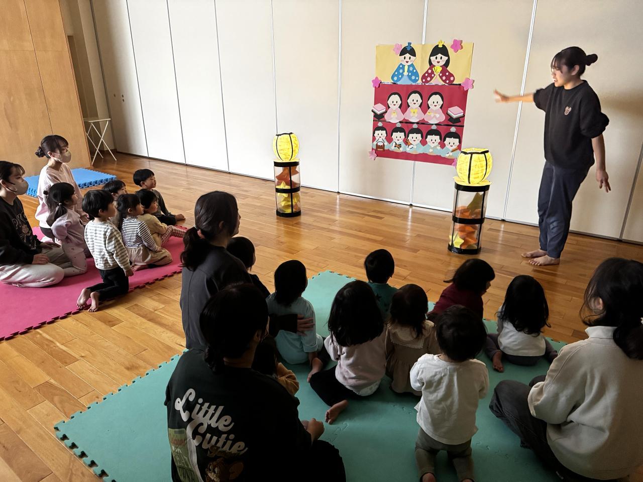 保育士が作ったおひなさまを飾りながら、簡単におひなさまの由来や、三人官女、五人囃子の持っている道具や楽器の話を聞いてひなまつりの雰囲気を楽しみました。