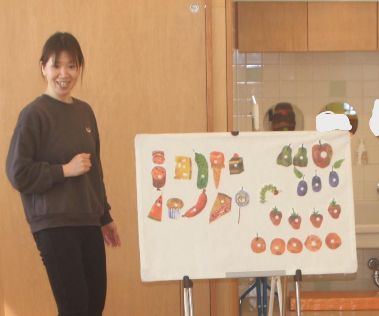 終わりの時間に、みんなで『はらぺこあおむし』のパネルシアターを見て、一人ずつメダルをプレゼントしました。