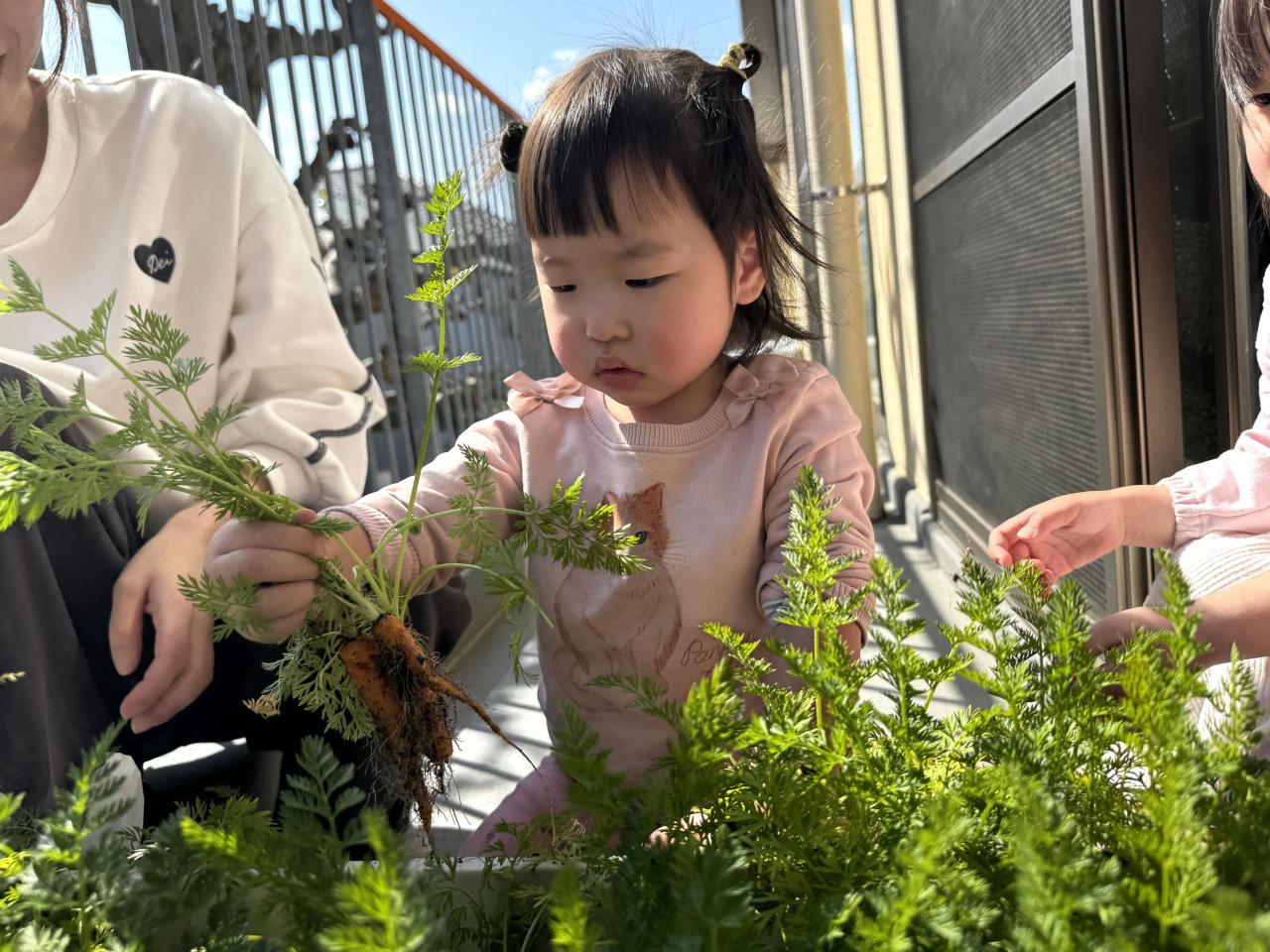 12日に、子どもたちが種から植えて、水やりして育てた人参を収穫しました。