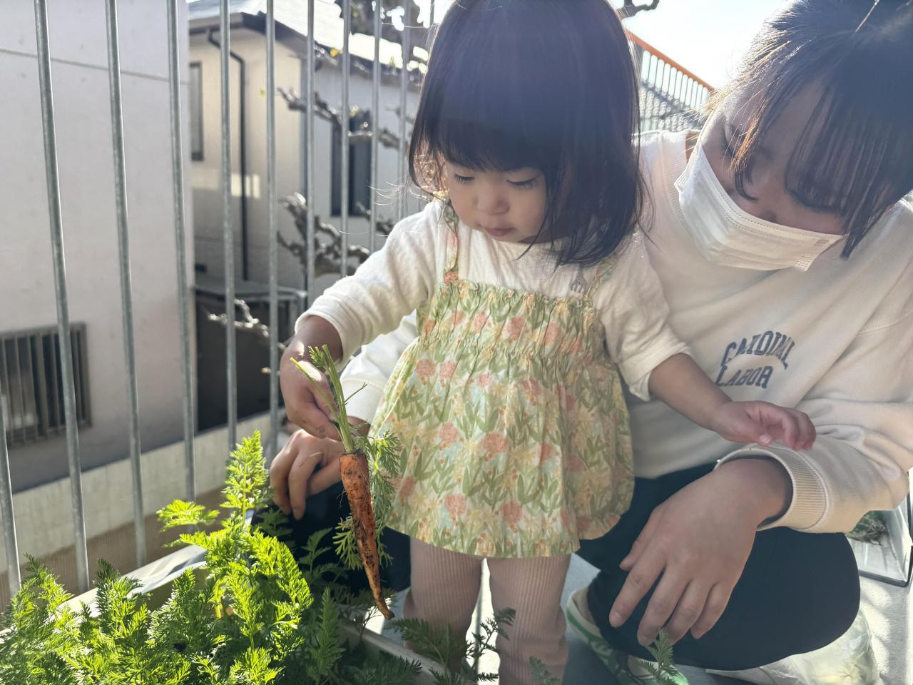 たくさん育った中から自分で選んだ人参の葉っぱを「よいしょ!」と抜くと、10センチほどの人参ができていて大喜びの子どもたち。