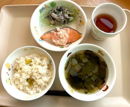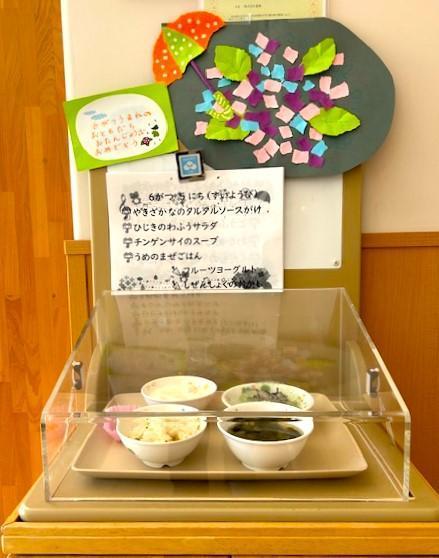 給食の時間は「梅雨」にちなんで、梅のまぜご飯を