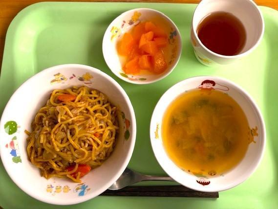 今日の給食は夏祭りをイメージした「焼きそば」です。一口食べて「おいしい」「焼きそば、好き」と感想をおしえてくれました。