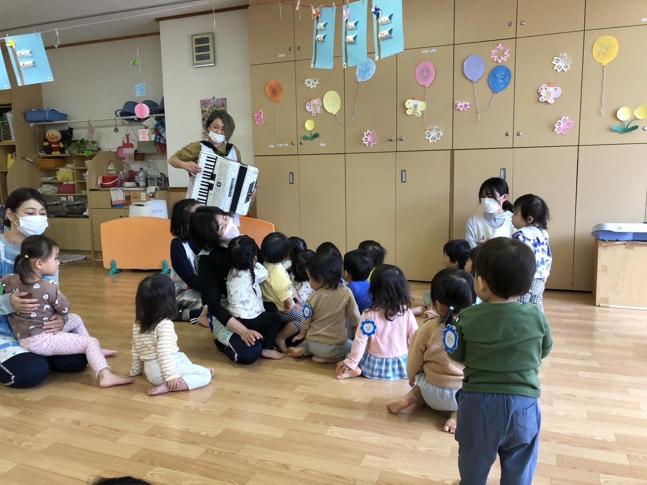 保育士のアコーディオンで伴奏に合わせて、乳児クラスは身体を横に揺らしたり、保育士を真似して手を叩いたりして楽しみました。