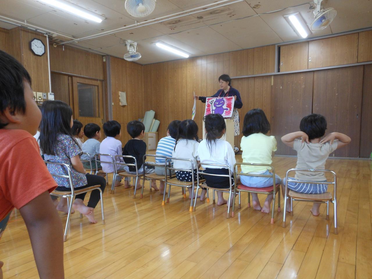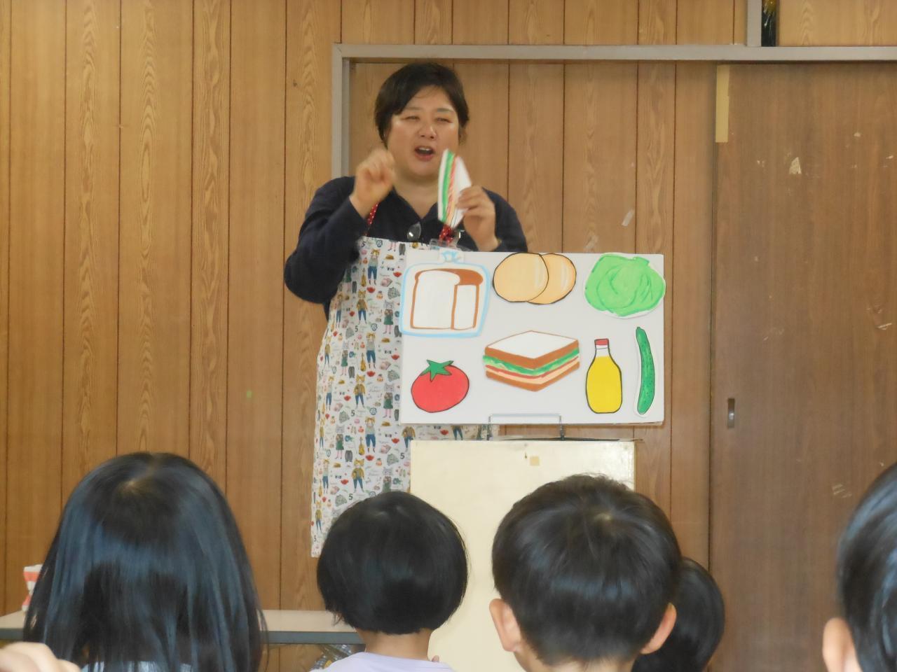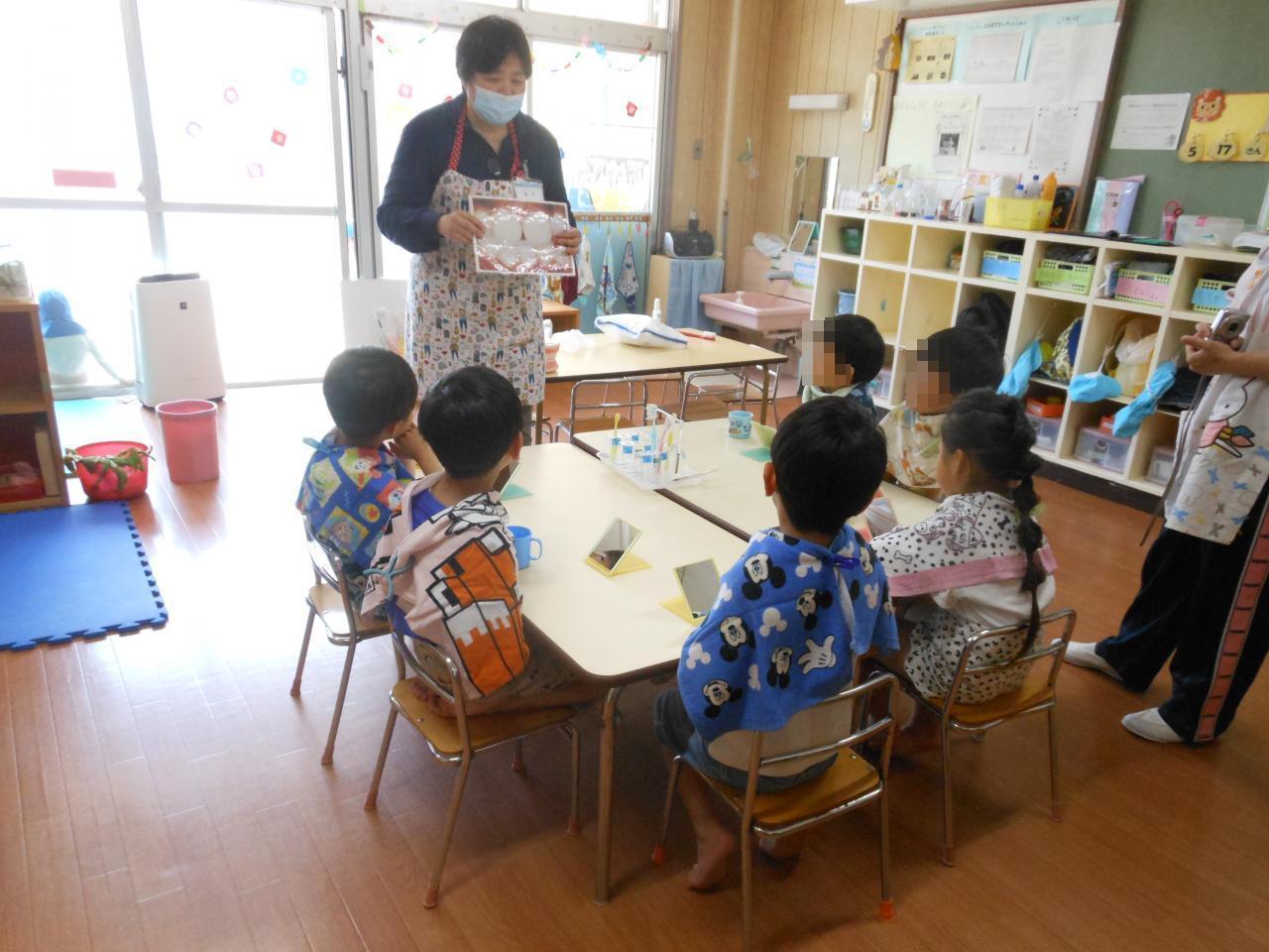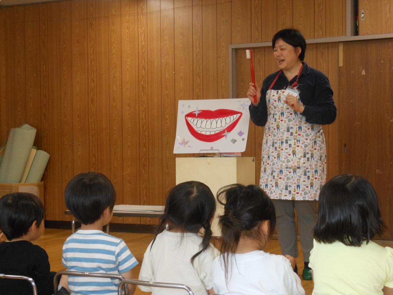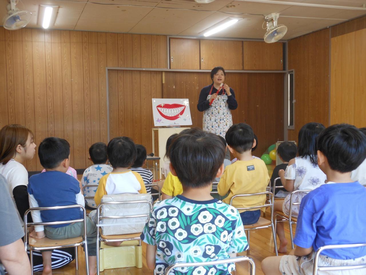 3.4.5歳児が歯磨き指導に参加しました。北部保健センターの歯科衛生士さんに来ていただき、紙芝居で歯の大切さについて教えてもらいました。紙芝居を見て、「むしばいきんや」「たべたらみがかないとあかん」など話していました。