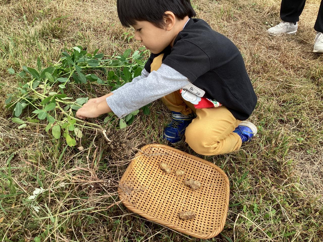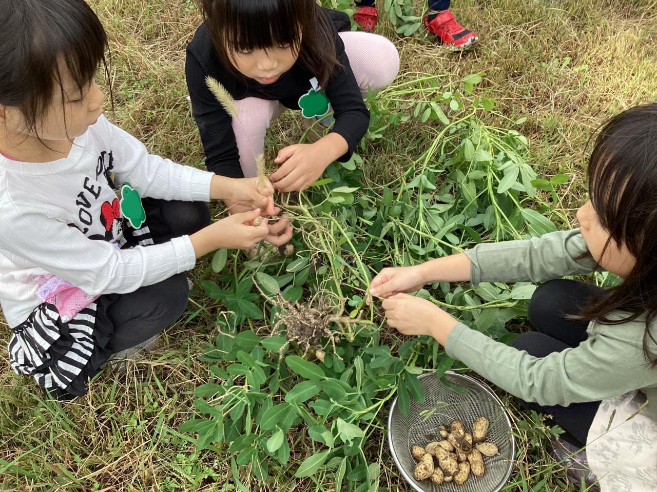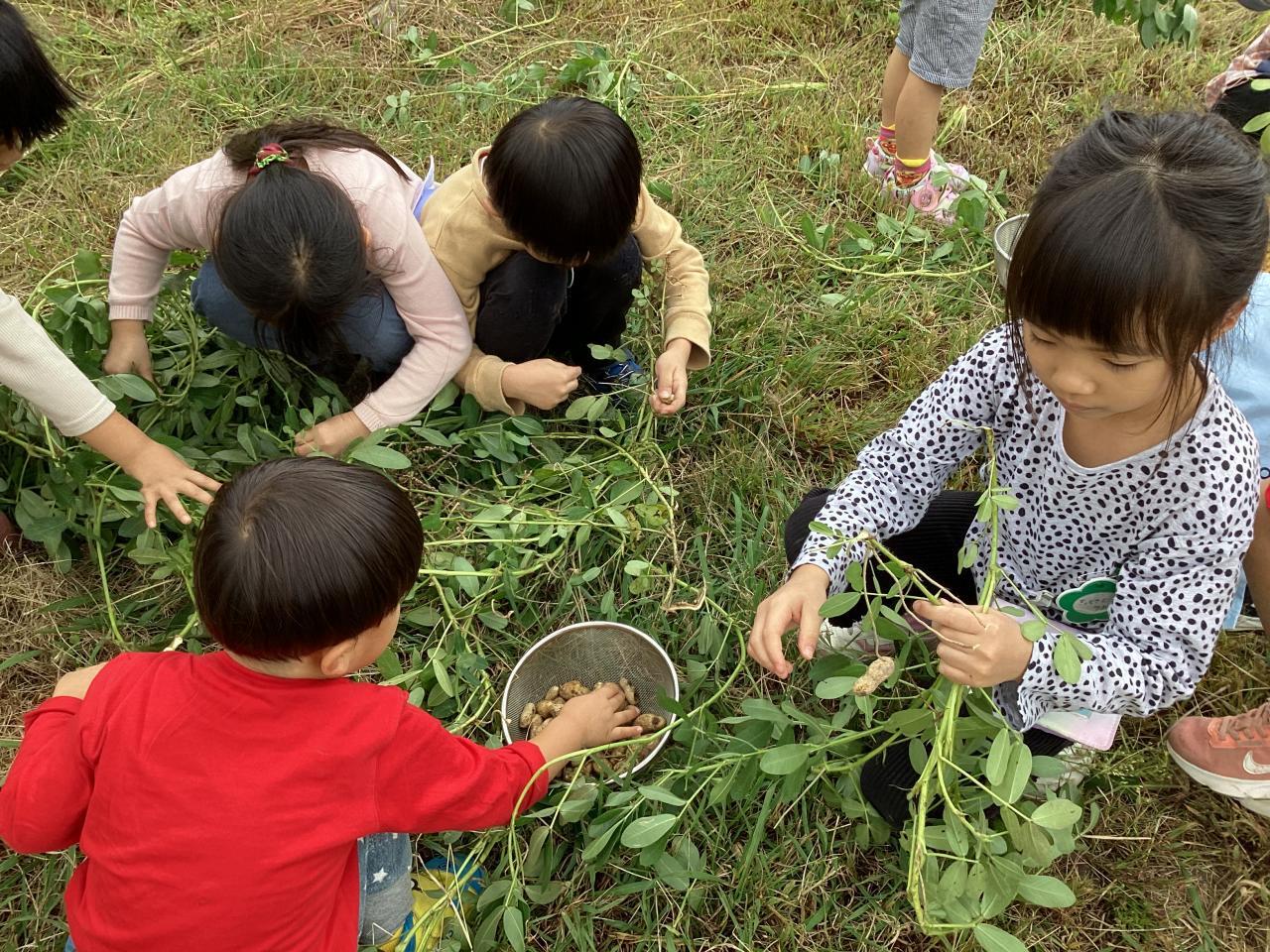 今日は松梅桃組(5、4、3歳児)で落花生の収穫を行います。