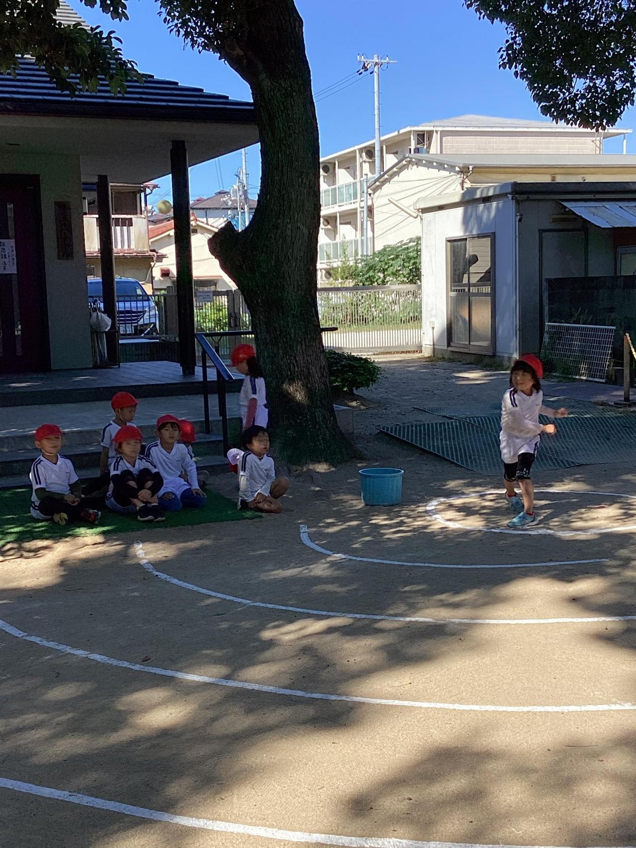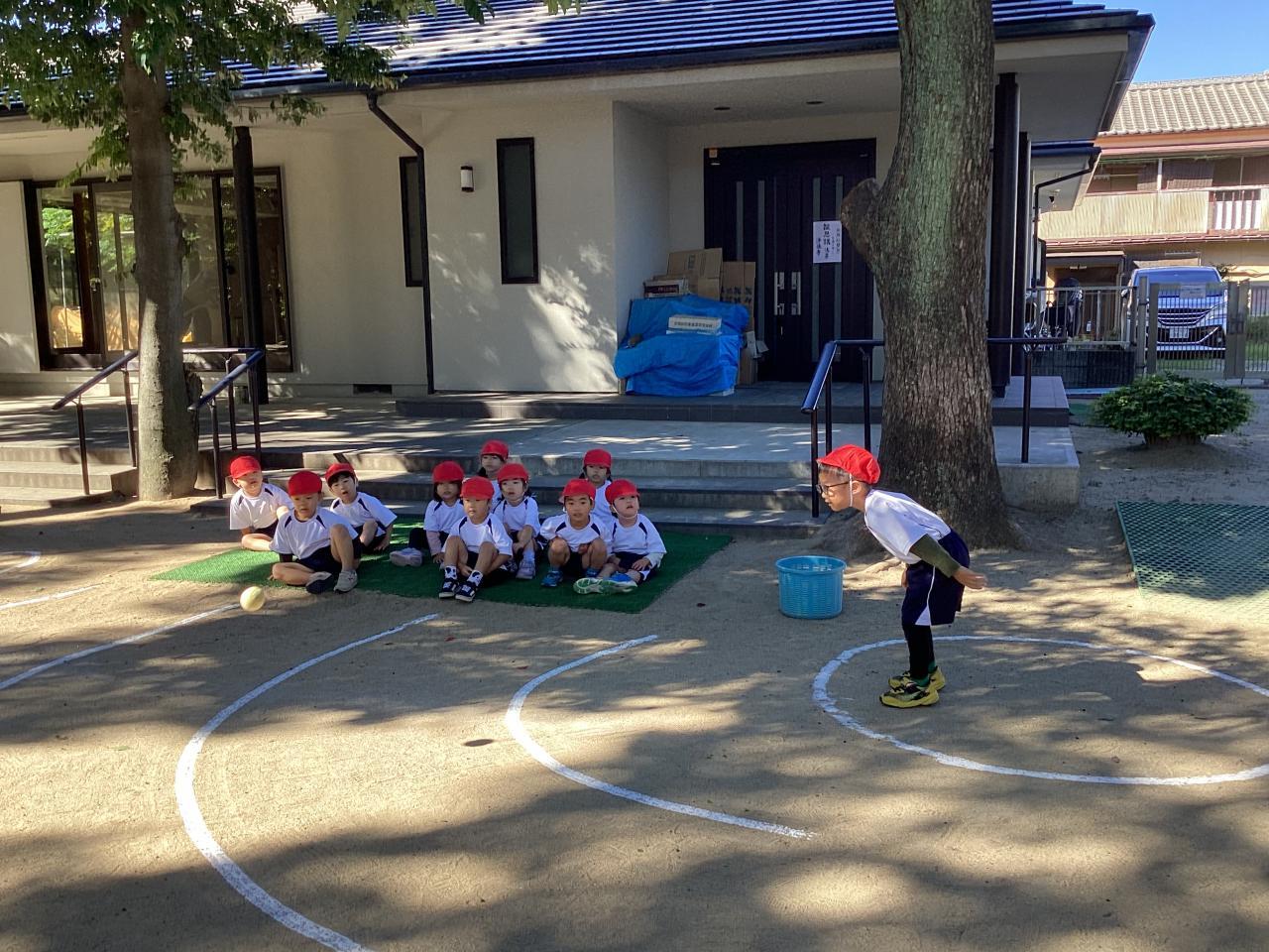 まずは桃組のボール投げ。先生のお手本から始まり、1人2回投げて良い方の記録(飛距離)を残します。