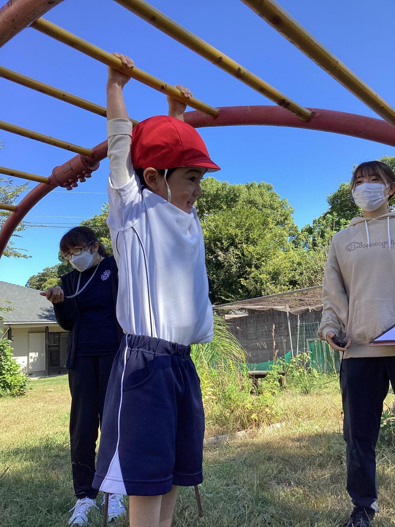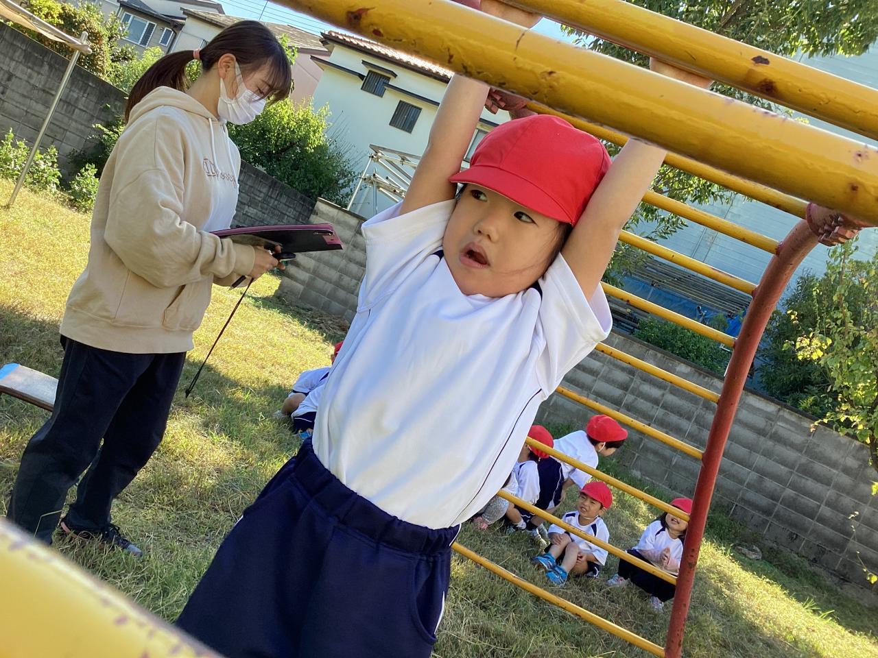 無心で微動だにせず、一点を見つめてぶら下がる子もいれば、「あー❗️もう無理〜‼️」とバタバタしながらも笑顔で、鉄棒を何度も持ち直しながら必死にぶら下がる子とタイプは色々です。