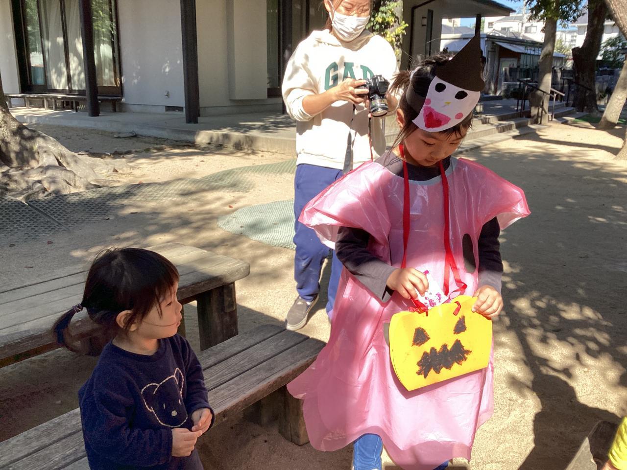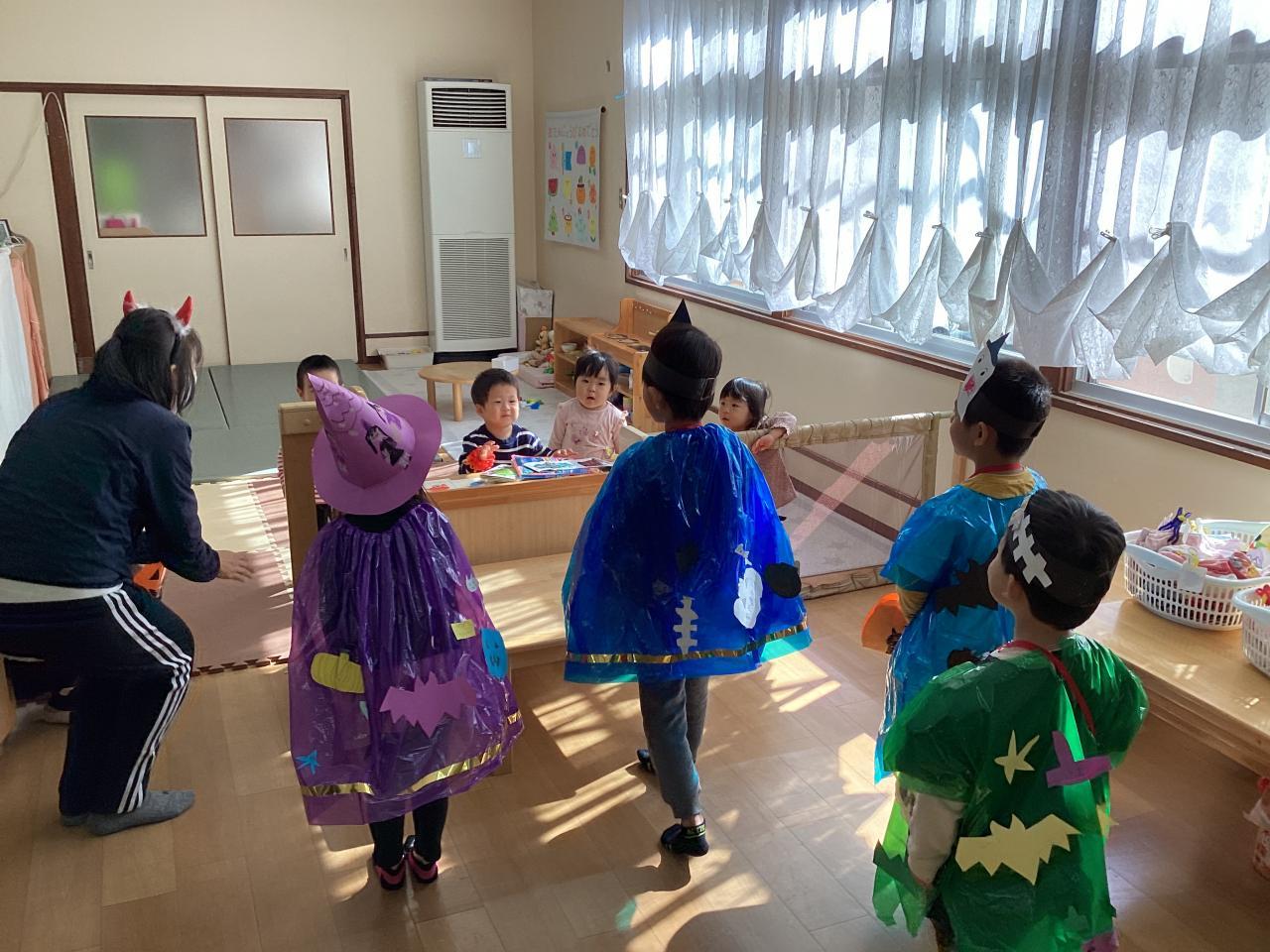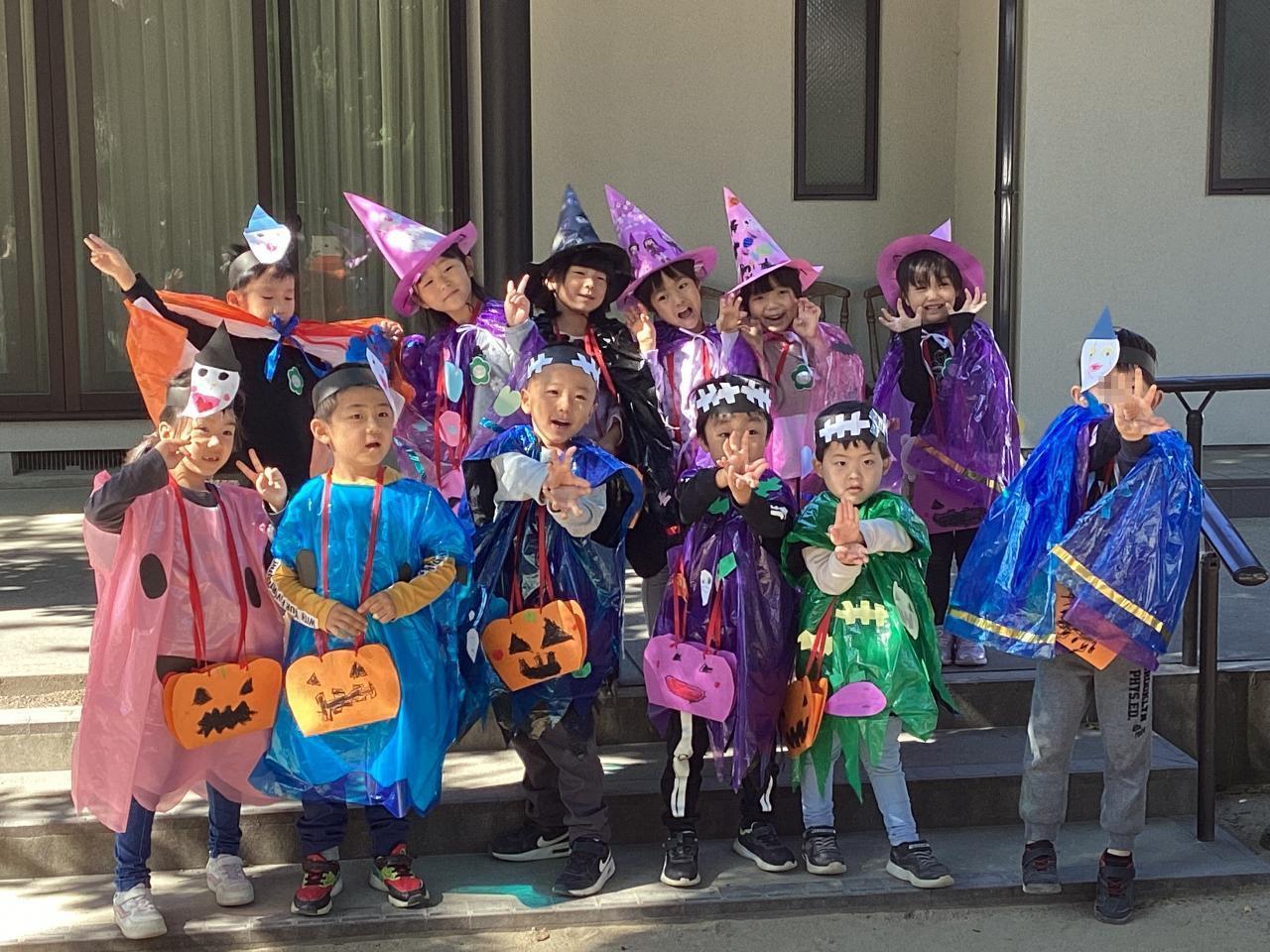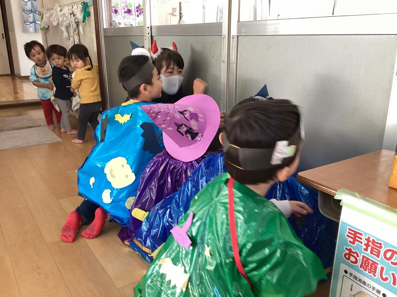 梅の花保育園では松組(5歳児)がオバケに変装して、各クラスを回っています。ご覧の通り可愛い魔女や、モンスターが一杯です☺️