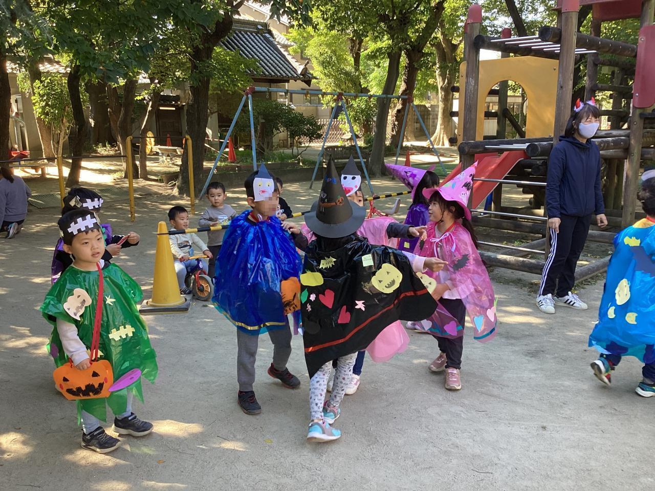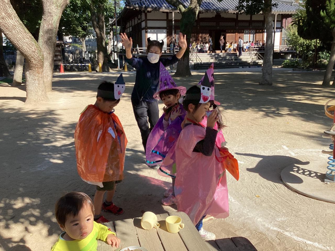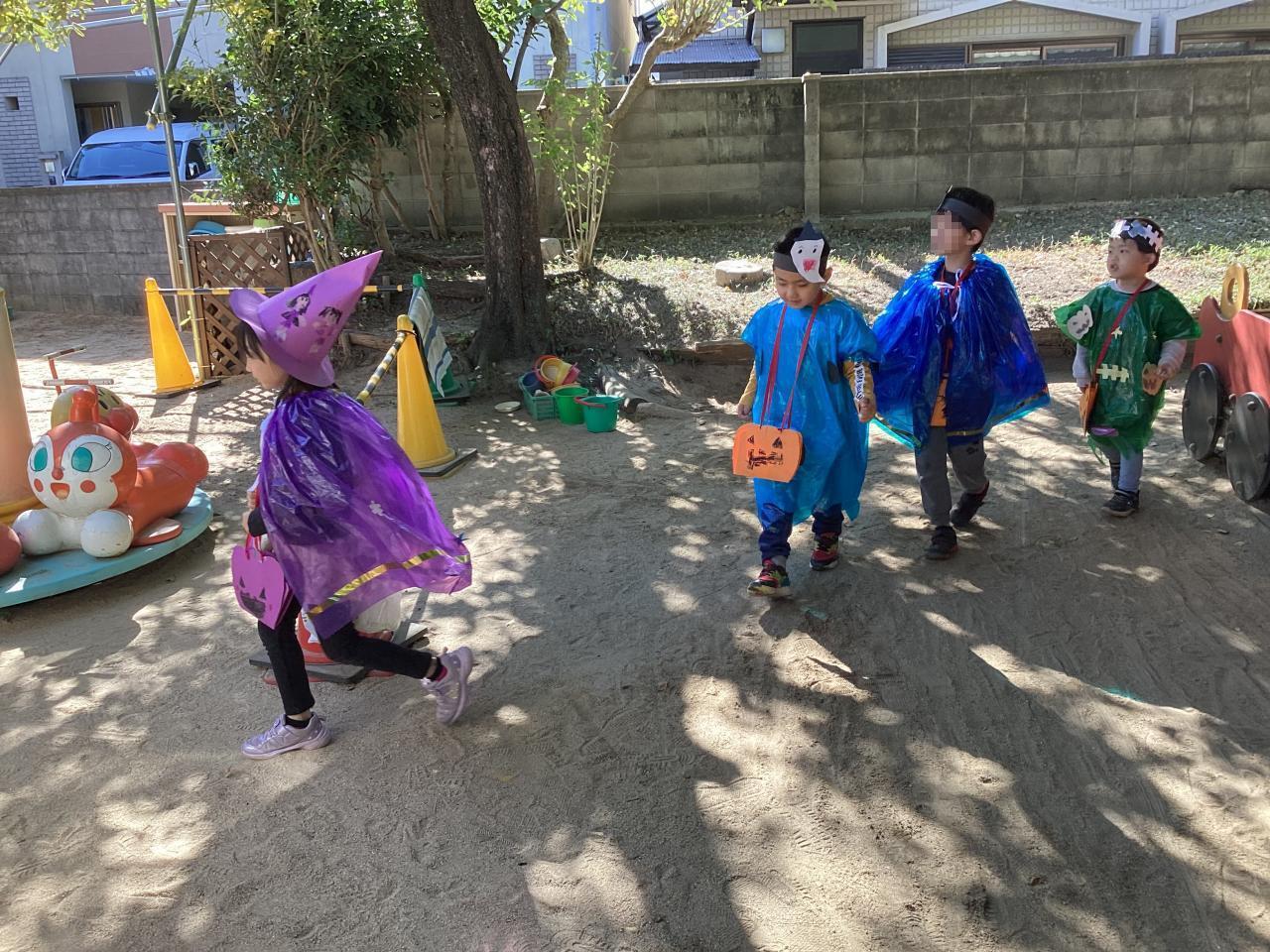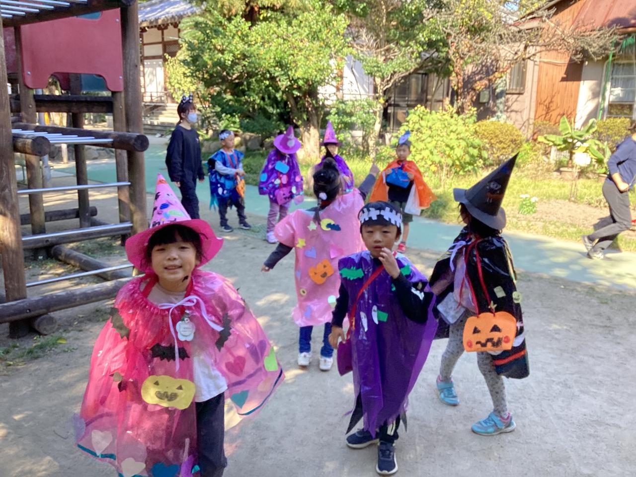 梅の花保育園では松組(5歳児)がオバケに変装して、各クラスを回っています。ご覧の通り可愛い魔女や、モンスターが一杯です☺️