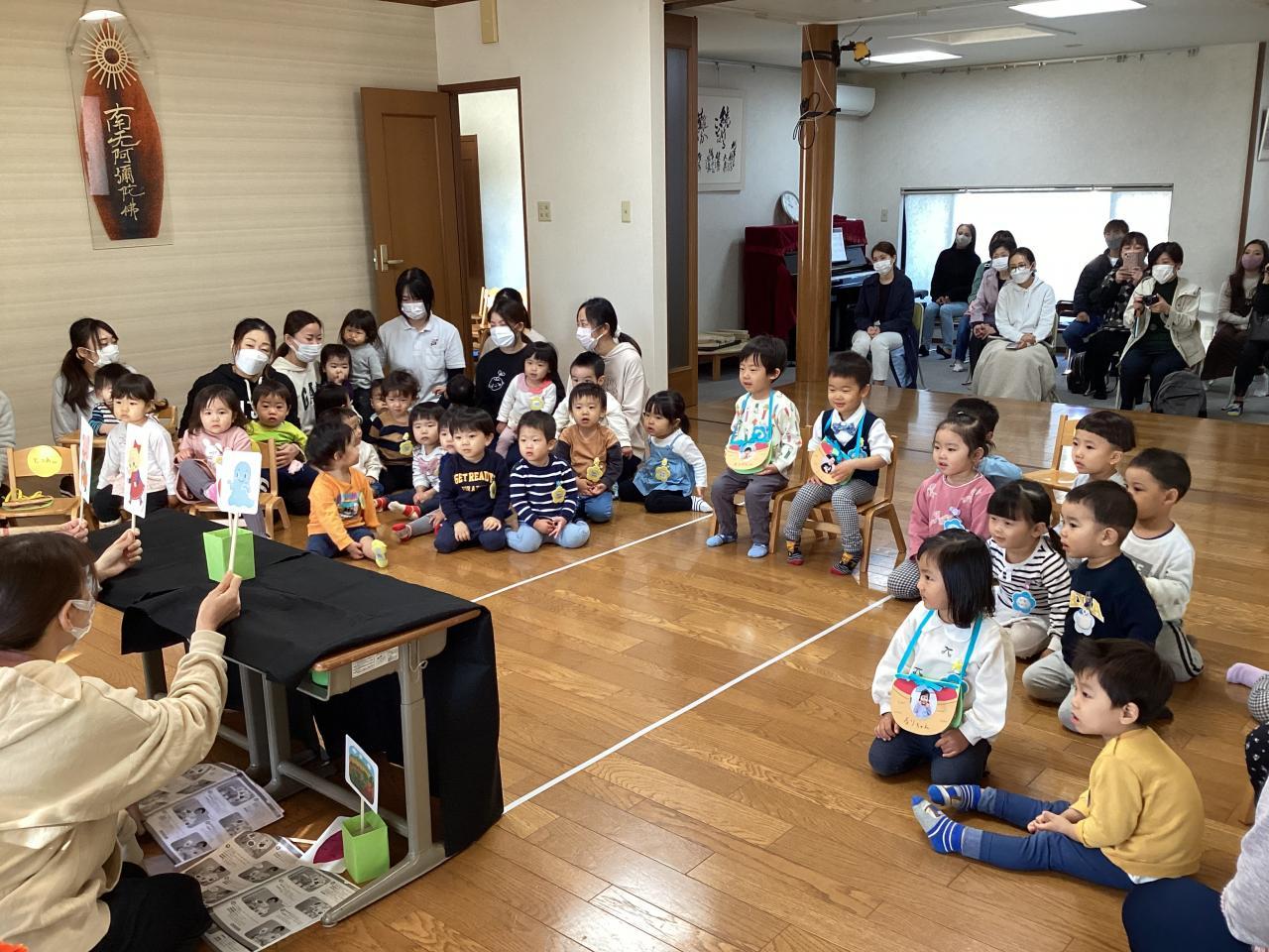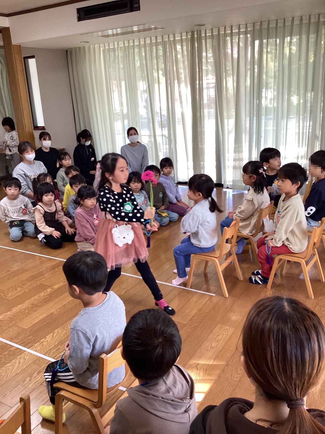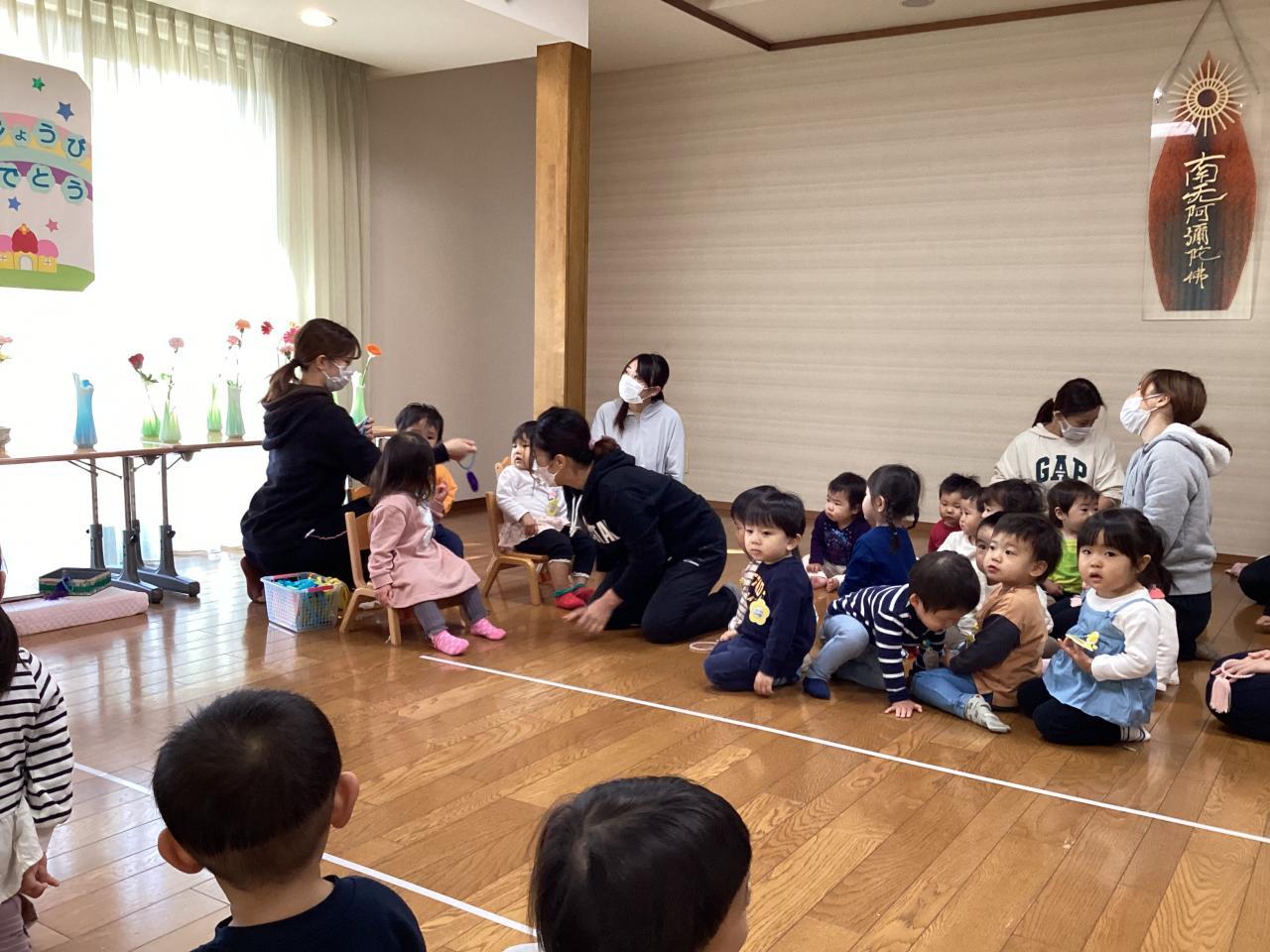 誕生児の人数を御数珠を集めて数え、お祝いの歌を歌ってその後はお楽しみ先生の出し物です☺️
