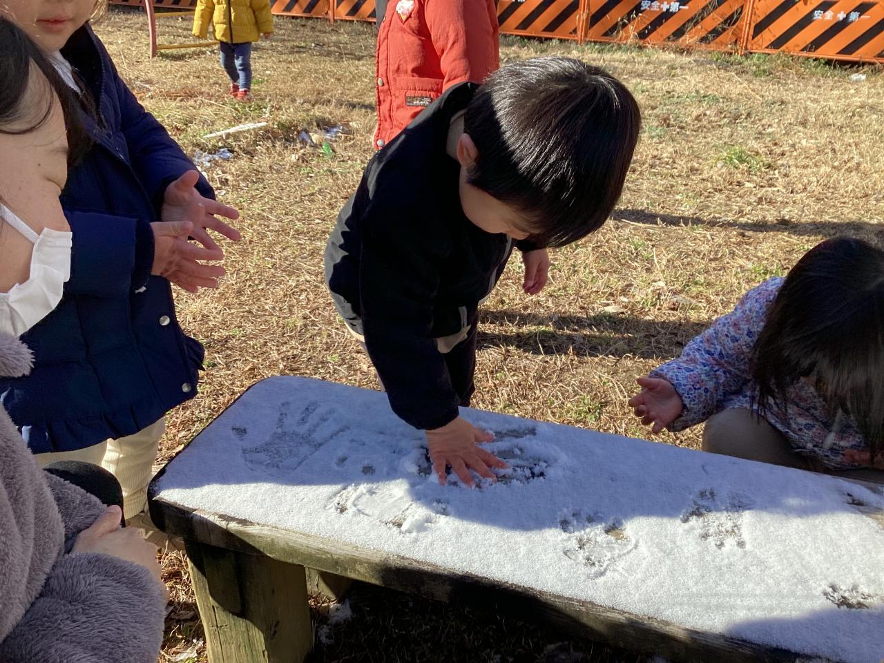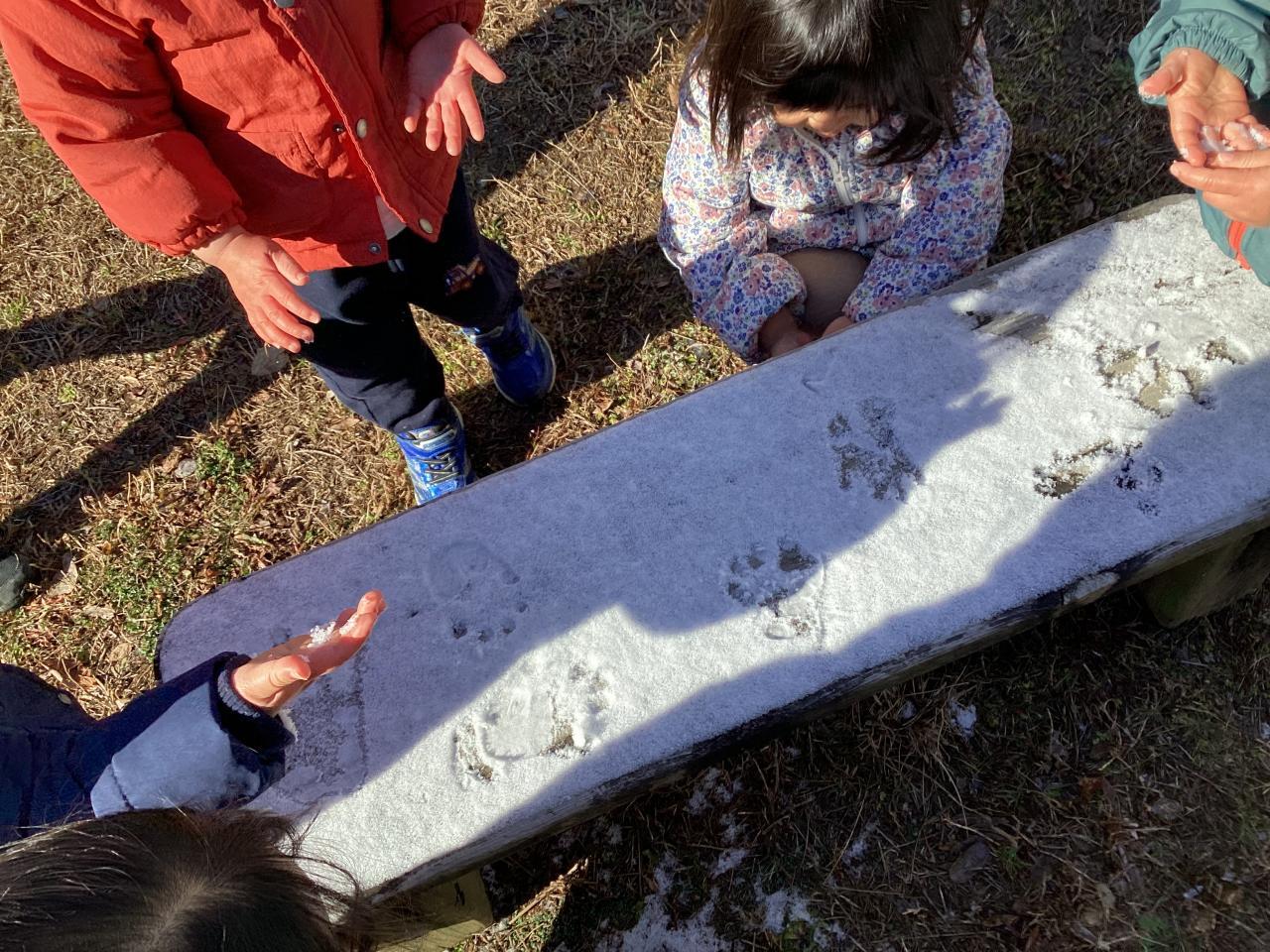 ベンチに積もったまっさらの雪にカワイイ手型がペタペタペタ。