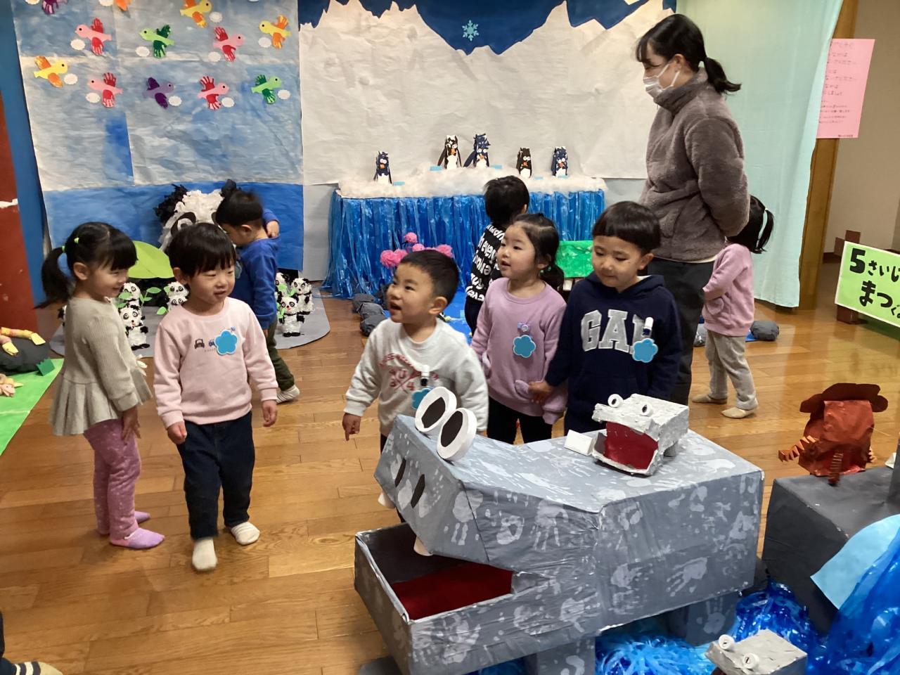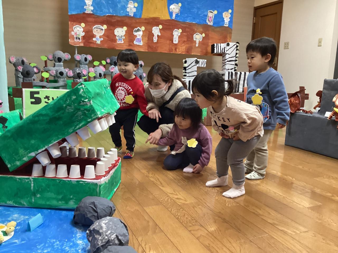 自分達で作った大きなワニの口を覗き大興奮のお友達☺️