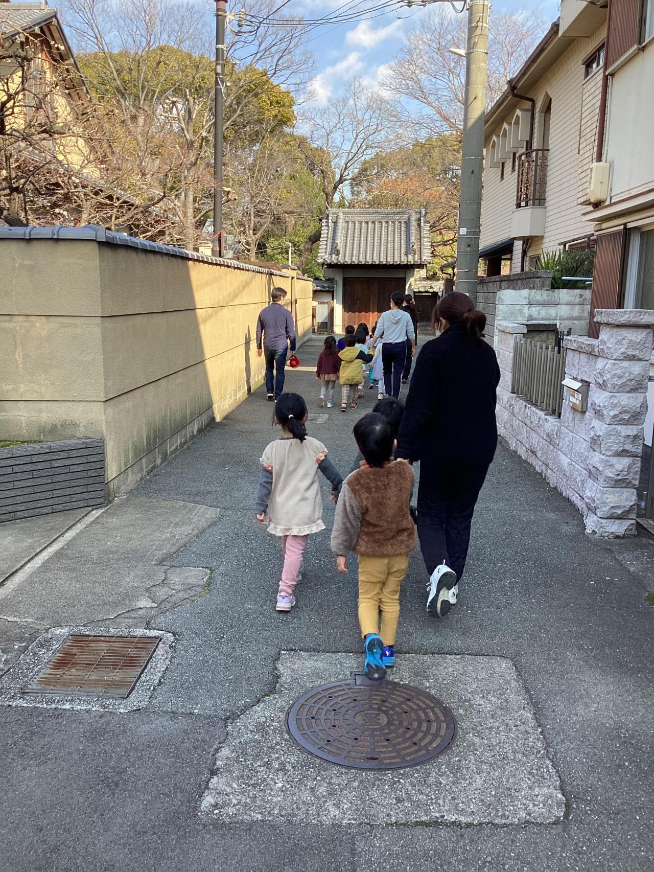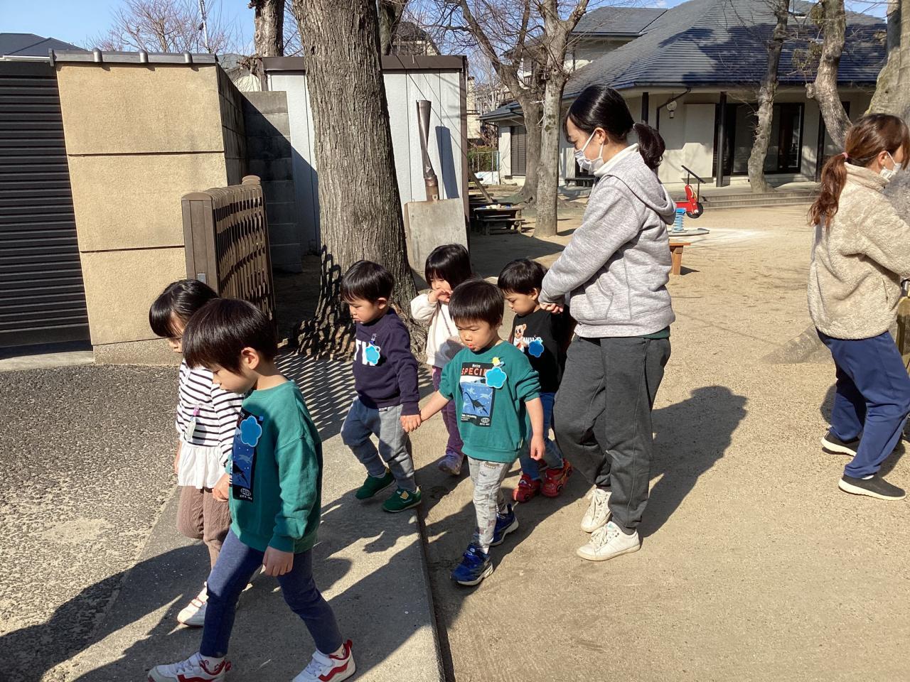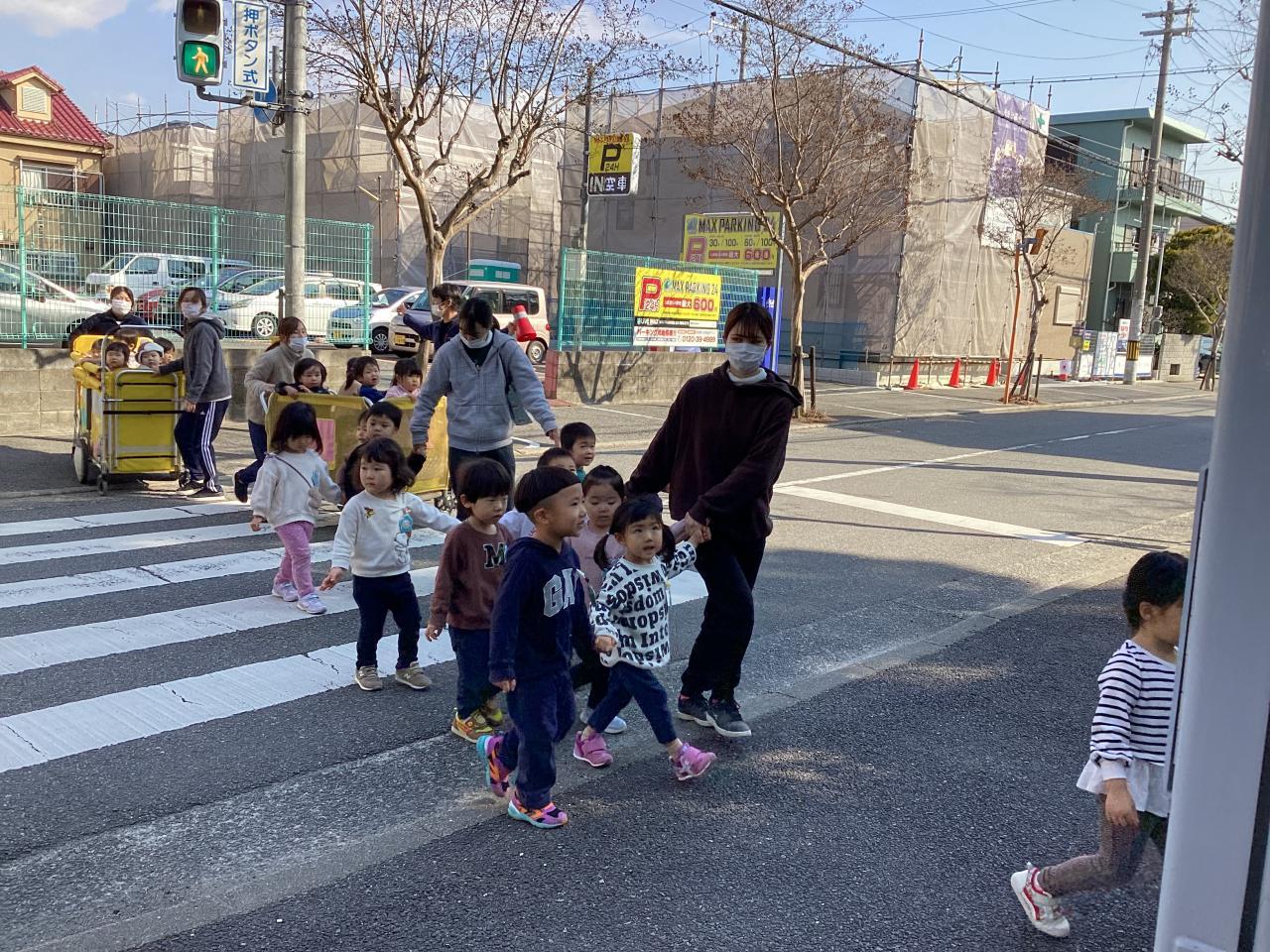 普段は端に寄って歩く道も、落下物に注意しながら道の真ん中を歩きます。そして全員無事に帰園し、本日の避難訓練は終了となりました。
