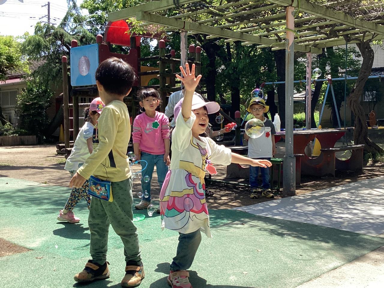 普段とは違い子ども達もお休みも多く、いつもなら賑やかな子ども達の声が響いている所、本日は静かな雰囲気の中のんびりと松梅組(5、4歳児)が園庭でしゃぼん玉遊びを楽しんでいました☺️
