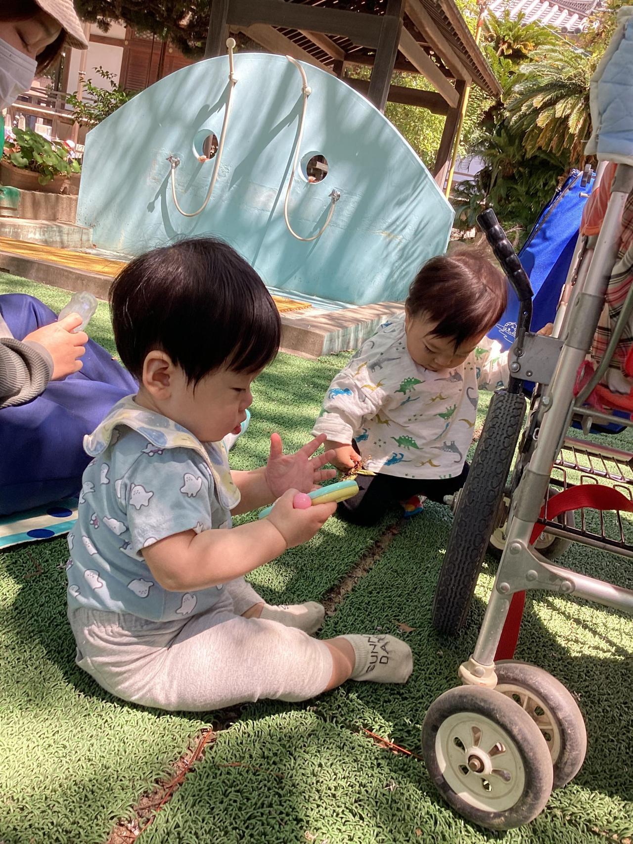 外用のおもちゃや落ちている葉っぱなど、どんな物にも興味津々☺️
