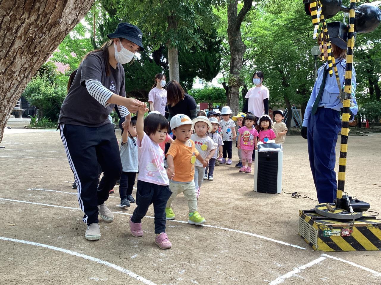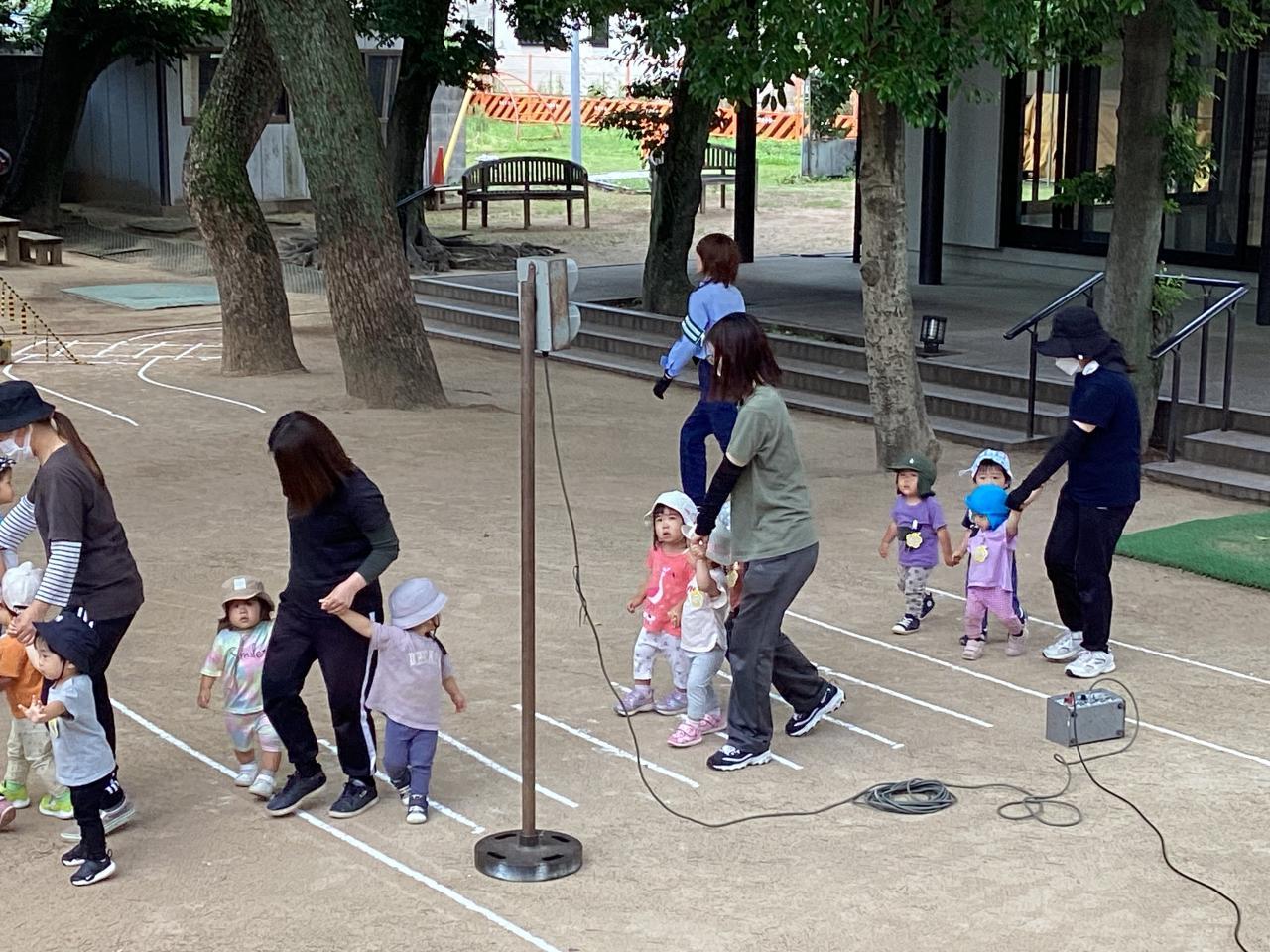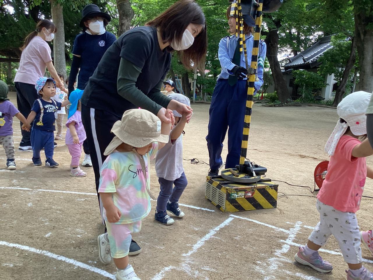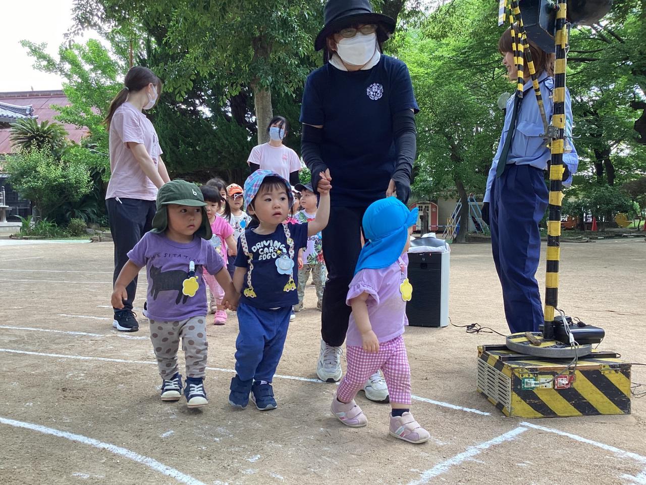 この後の実施訓練に向け準備万端な運動場で、はとひよこ組(2、1歳児)がこっそり体験させて貰っていました☺️