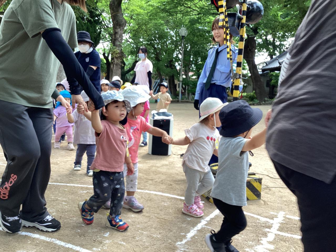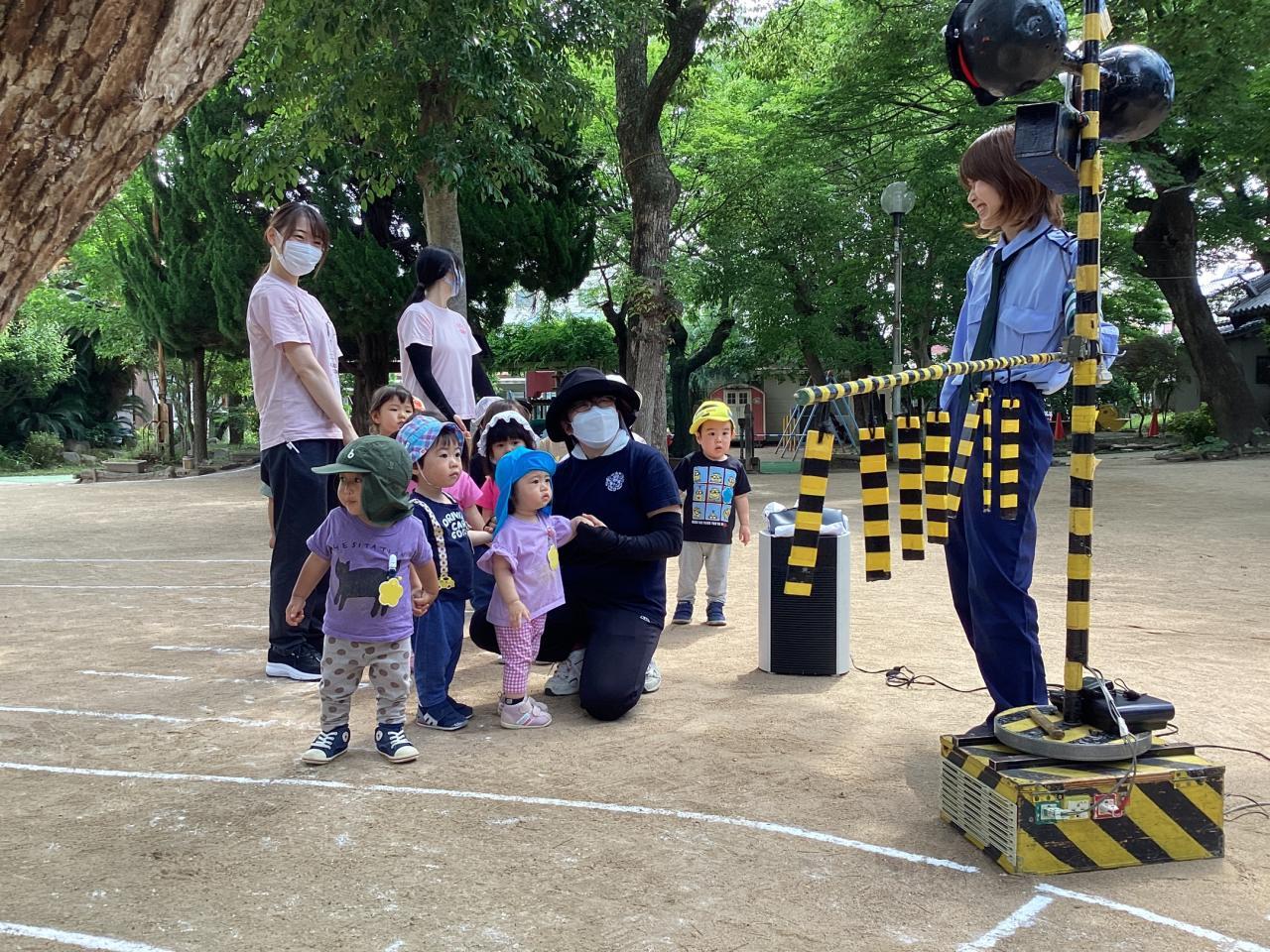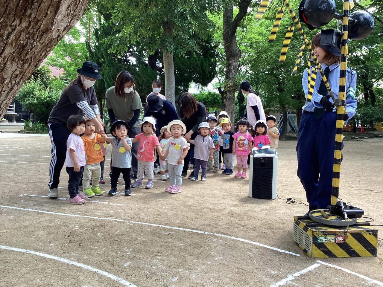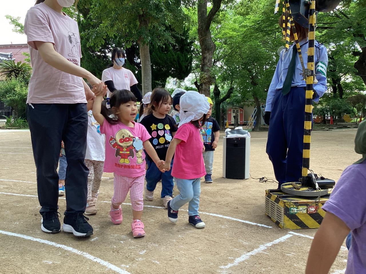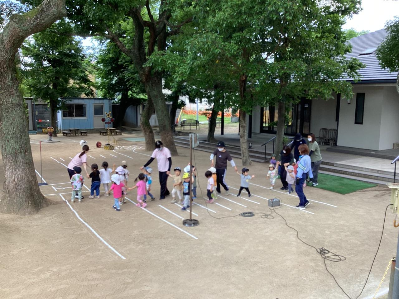 この後の実施訓練に向け準備万端な運動場で、はとひよこ組(2、1歳児)がこっそり体験させて貰っていました☺️